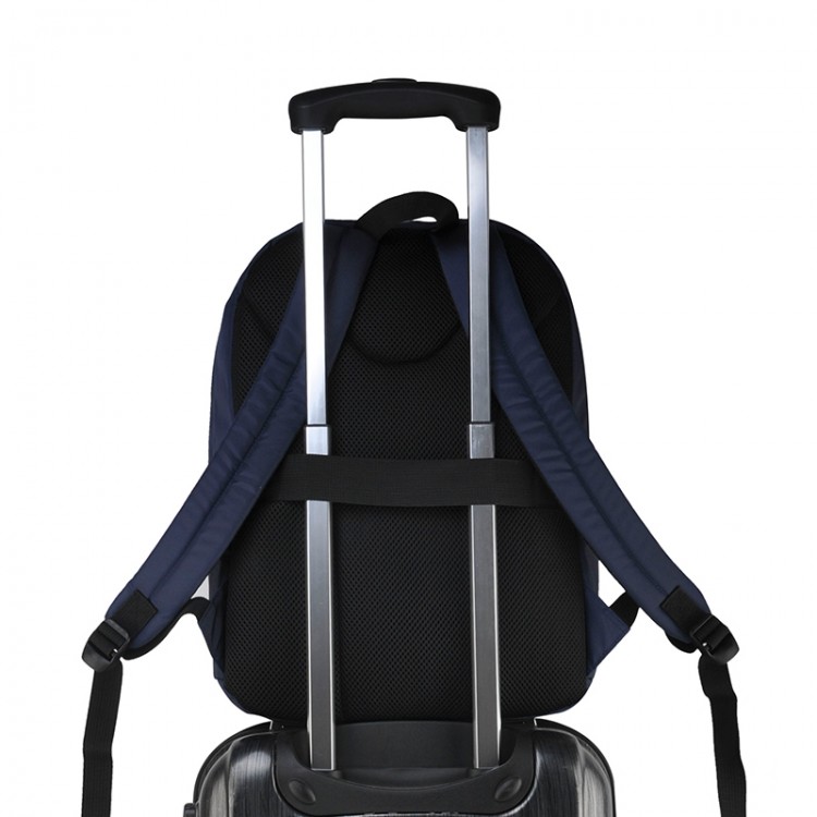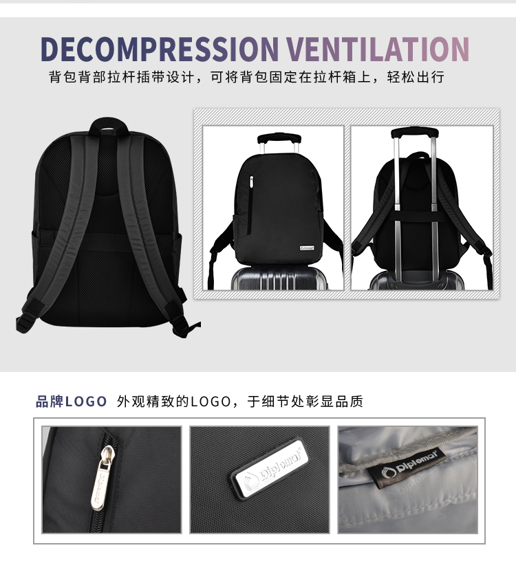 6.背包背部拉桿插帶設(shè)計(jì),可將背包固定在拉桿箱上,輕松出行;