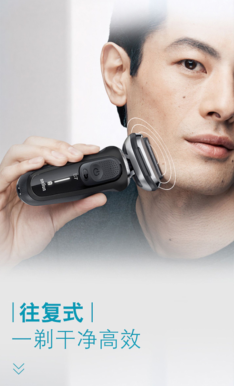 360°貼膚系統(tǒng):刀頭前后擺動(dòng)20°,三個(gè)元件上下浮動(dòng),刀頭左右運(yùn)動(dòng),更加貼面,橫掃難剃部位
