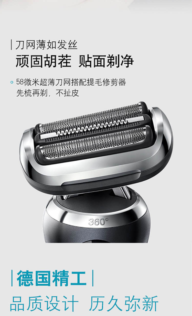 德系精工三刀頭,8方向靈活微調(diào);58微米超薄刀網(wǎng),輕松捕捉難剃胡須。