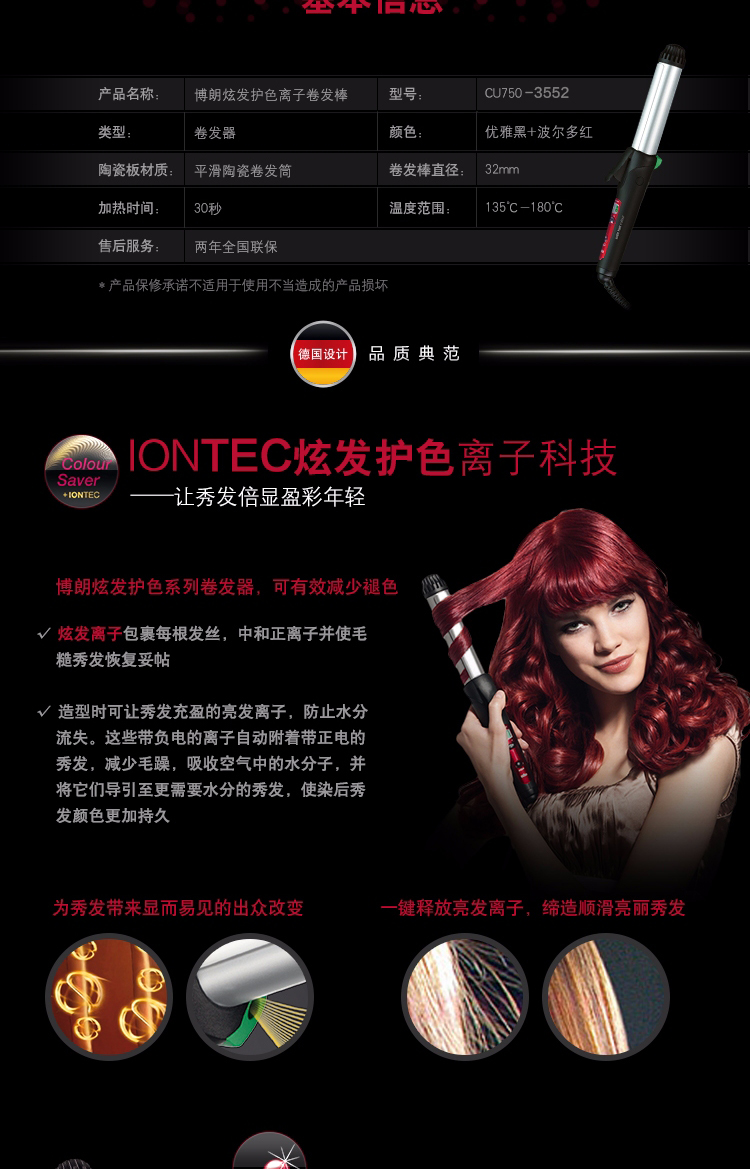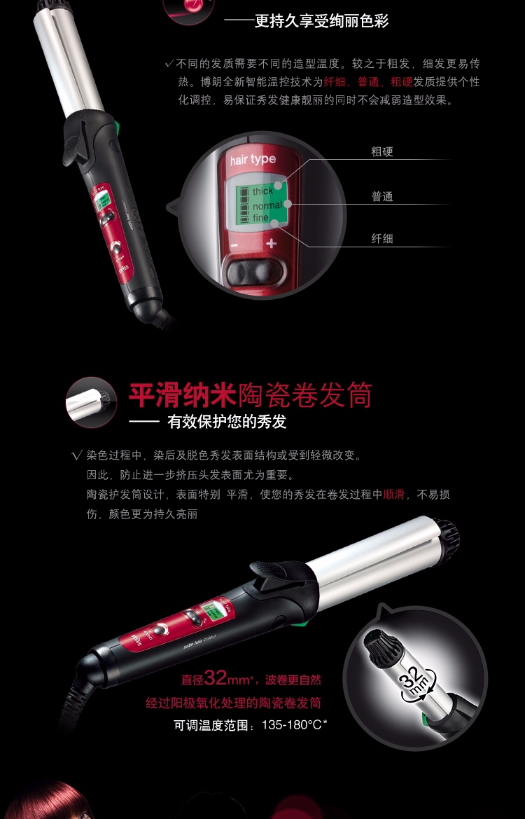 均衡溫度控制:在135-180度之間5檔精準(zhǔn)預(yù)設(shè)溫度,經(jīng)過陽極氧化處理的陶瓷卷發(fā)筒有效保護(hù)敏感發(fā)梢,避免秀發(fā)因過熱而黯淡枯萎
