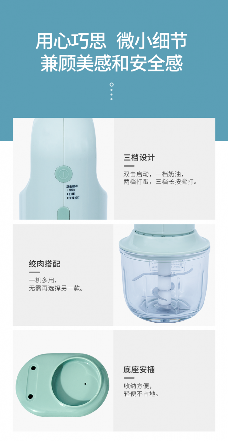 4.雙擊啟動,三擋設計,一檔奶油、二檔打蛋、長按絞肉,功能簡單操作化繁為簡;