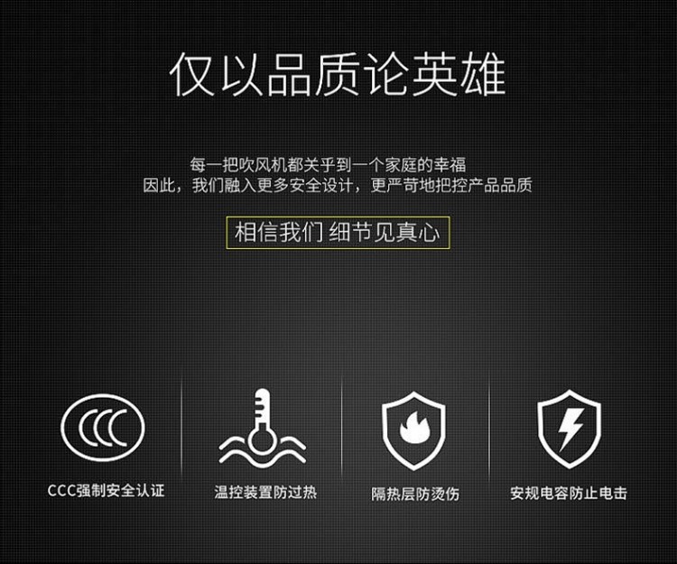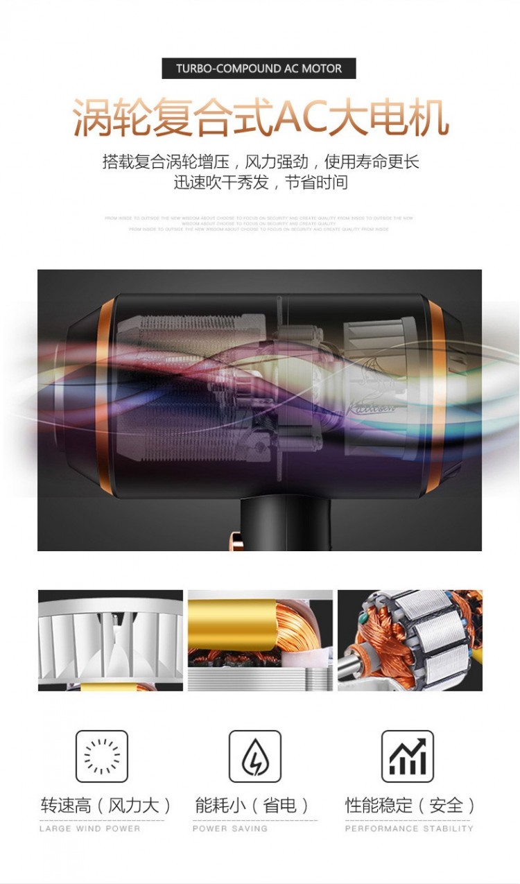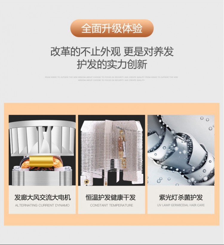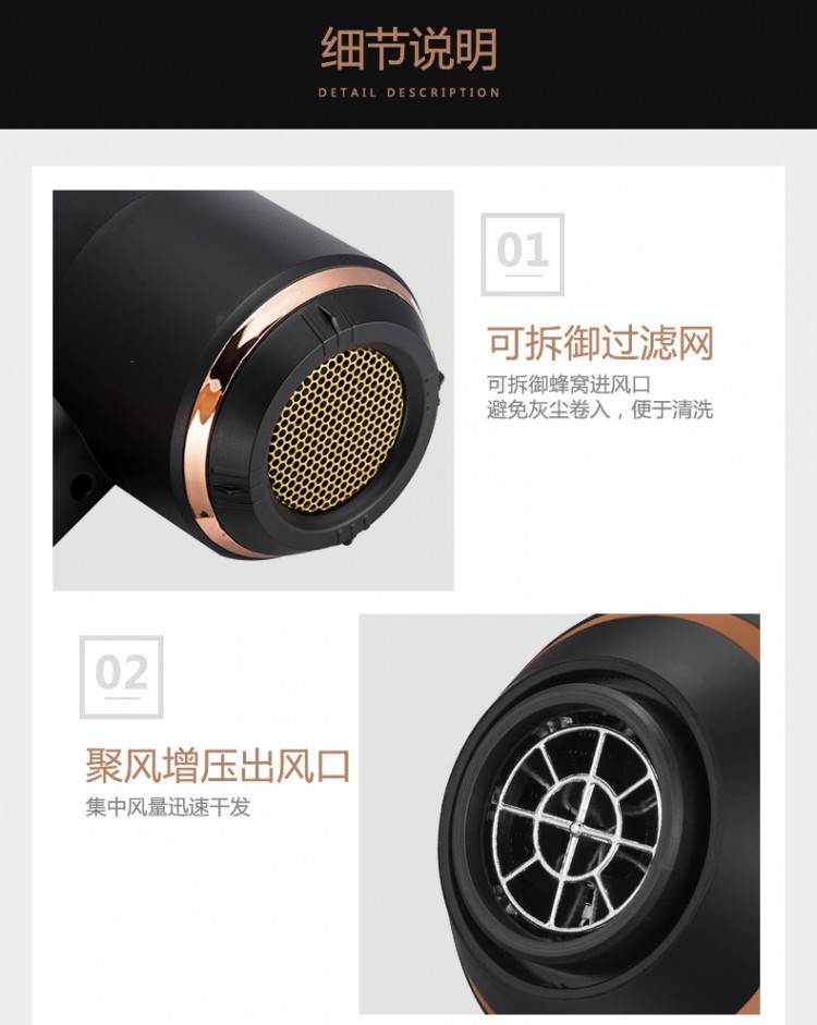 詳細(xì)信息 產(chǎn)品特點(diǎn): 1.AC純銅電機(jī)、2.2米純銅電源線; 2.UV殺菌燈設(shè)計(jì)、機(jī)身ABS材質(zhì)、外噴高級(jí)手感漆; 3.冷熱風(fēng)轉(zhuǎn)換鎖定開關(guān)、溫控過熱保護(hù)設(shè)計(jì); 4.兩檔風(fēng)量設(shè)置、波紋絲造型發(fā)熱絲; 5.配一個(gè)大風(fēng)罩(定型頭發(fā)用)、兩個(gè)小風(fēng)嘴。 ![]() ![]() ![]() ![]() ![]() ![]() ![]() ![]() ![]() ![]() ![]() ![]()  |