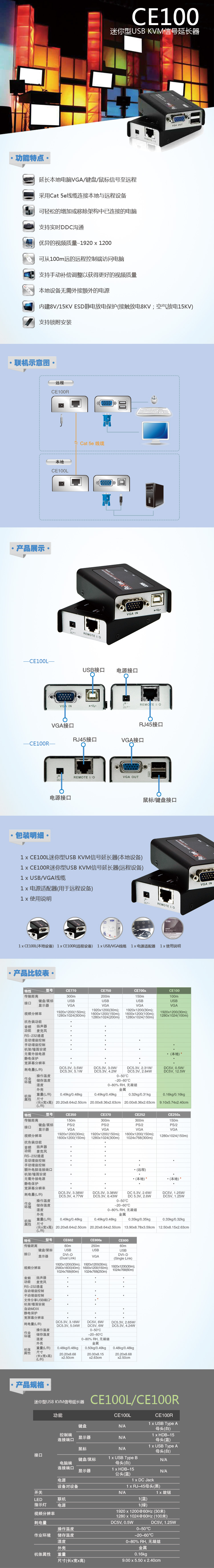 CE100強(qiáng)化了先前的設(shè)計(jì):1) 于遠(yuǎn)程設(shè)備使用補(bǔ)償調(diào)整功能以獲得更好的影像質(zhì)量;2) 采用價(jià)格實(shí)惠的Cat 5e線纜,取代笨重且昂貴的標(biāo)準(zhǔn)線纜,以提供更簡(jiǎn)潔、方便、穩(wěn)定的信息傳輸連接。