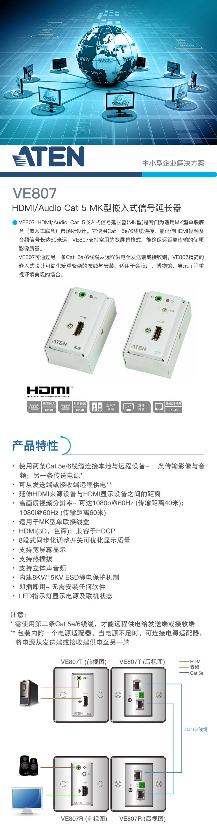 VE807可通過另一條Cat 5e/6線纜從遠(yuǎn)程供電至發(fā)送端或接收端。VE807精簡的嵌入式設(shè)計(jì)可簡化笨重繁雜的布線與安裝,適用于會議廳、博物館、展示廳等重視環(huán)境美觀的場合。