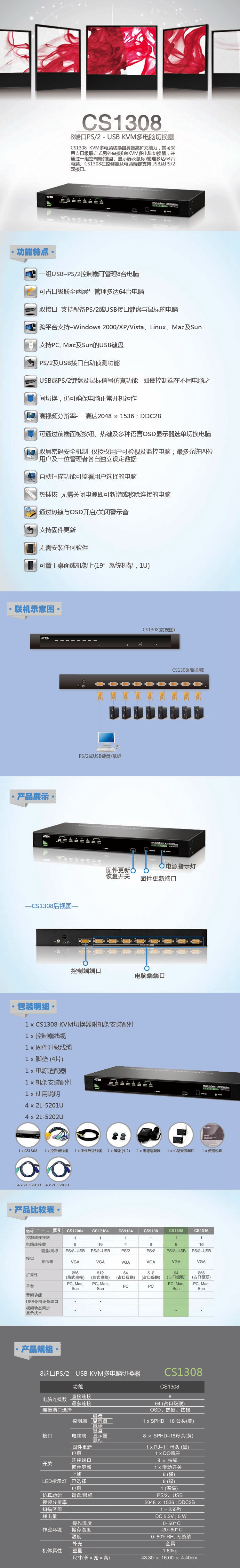 CS1308 KVM多電腦切換器具備高擴充能力,其可采用占口級聯(lián)方式另外串接8臺KVM多電腦切換器,并通過一組控制端(鍵盤、顯示器及鼠標)管理多達64臺電腦。CS1308在控制端及電腦端都支持USB及PS/2雙接口。