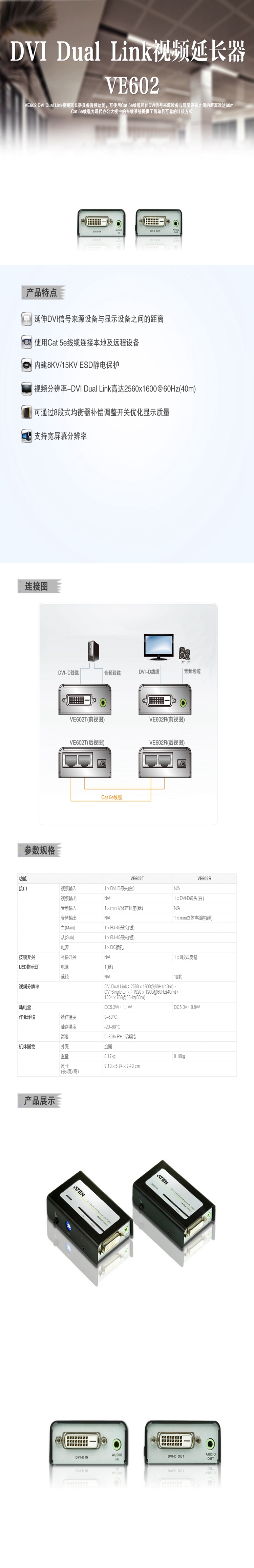 VE602 DVI Dual link視頻延長器具備音頻功能,可使用Cat 5e線纜延伸DVI信號來源設備與顯示設備之間的距離遠達60m。Cat 5e線纜為現(xiàn)代辦公大樓中的布線系統(tǒng)提供了簡單且可靠的連接方式。