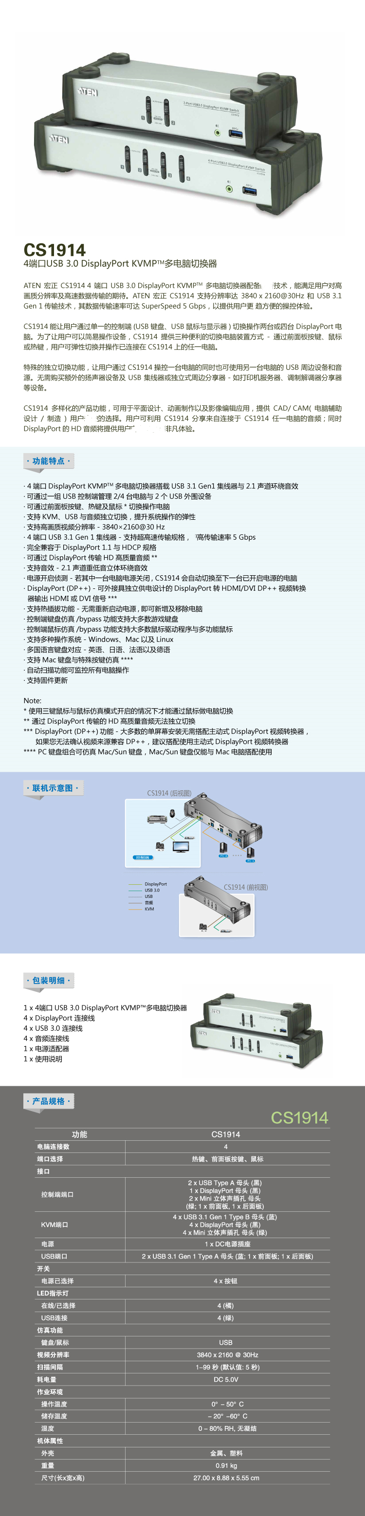 CS1914能讓用戶通過(guò)單一的控制端(USB鍵盤、USB鼠標(biāo)與顯示器)切換操作四臺(tái)DisplayPort電腦。為了讓用戶可以簡(jiǎn)易操作設(shè)備,CS1914提供三種便利的切換電腦裝置方式 - 通過(guò)前面板按鍵、鼠標(biāo)或熱鍵,用戶可彈性切換并操作已連接在 CS1914上的任一電 腦。