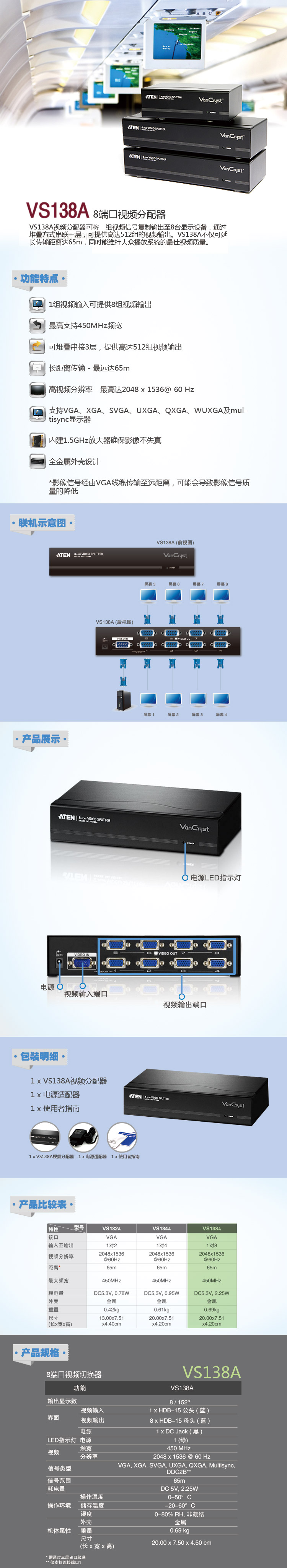 對(duì)于需要輕松遠(yuǎn)距傳輸多個(gè)高畫(huà)質(zhì)VGA、XGA、SVGA、UXGA、QXGA,WUXGA或multisync視頻的使用者而言,VS138A是一套相當(dāng)理想的解決方案。
