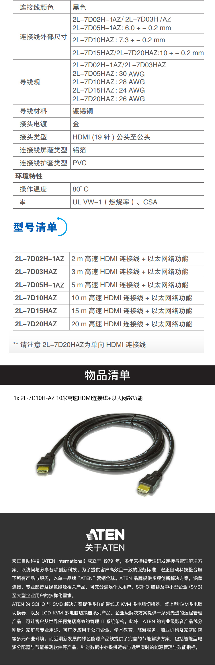 ATEN 宏正 2L-7D10H-AZ HDMI高清線 4k電腦電視連接數(shù)據(jù)線 10米