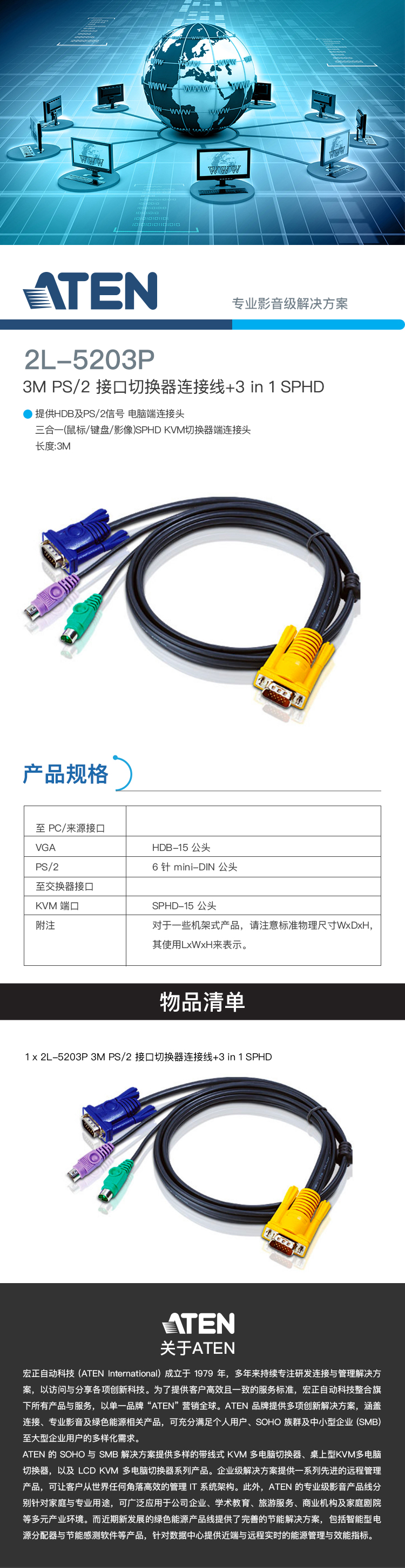 ATEN 宏正 四川成都 2L-5203P KVM分銷服務(wù)商 3M PS/2 接口切換器連接線+3 in1 SPHD 2L-5203P 長3米