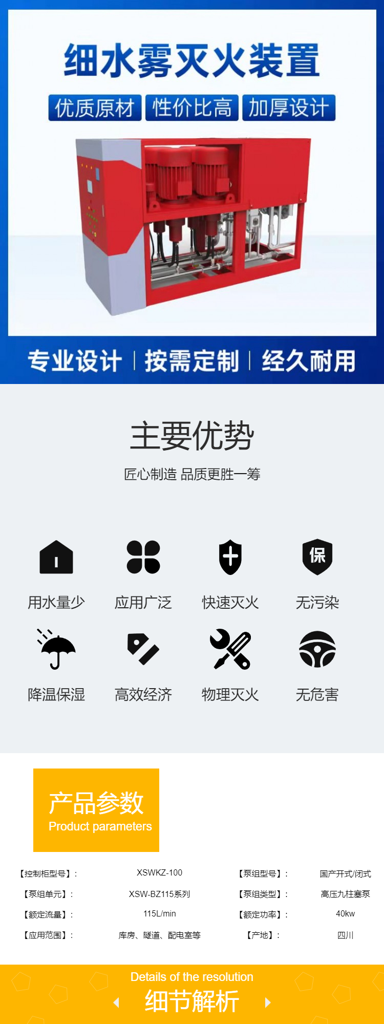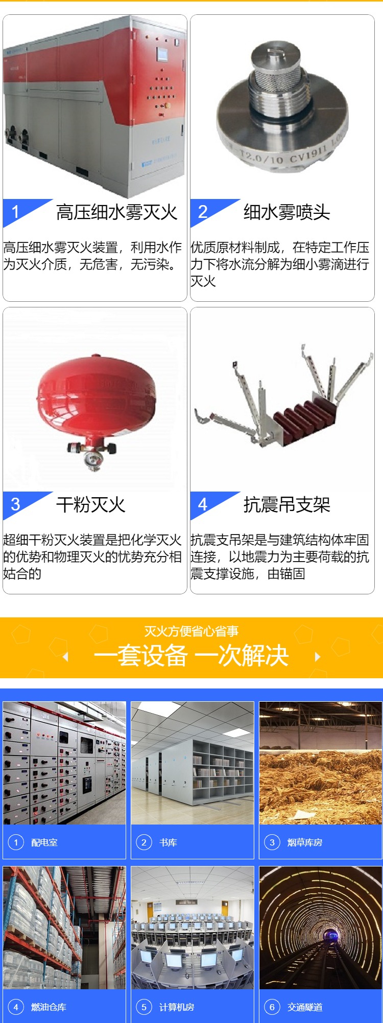 滅火機(jī)理:高壓細(xì)水霧以水為滅火介質(zhì),無污染,用水量是消防栓的五十分之一,以水為滅火介質(zhì),用量少,環(huán)保節(jié)能。