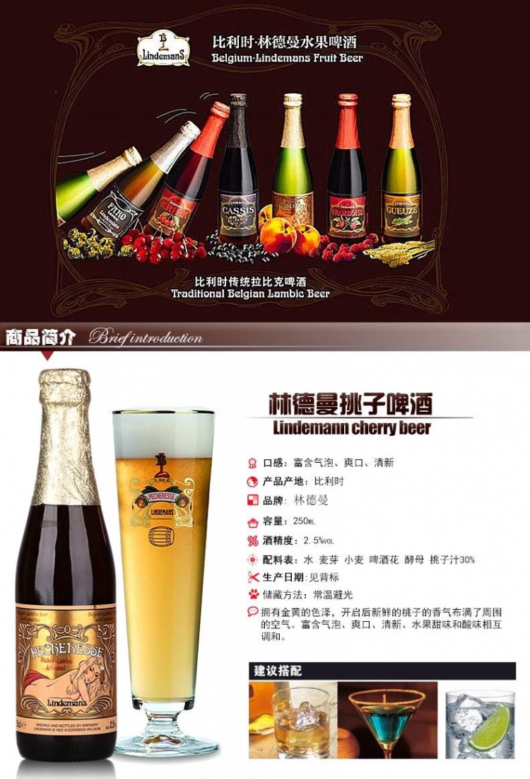 比利時進口 林德曼櫻桃/藍莓/桃子/蘋果/山莓果味啤酒250ml*24瓶 進口啤酒
