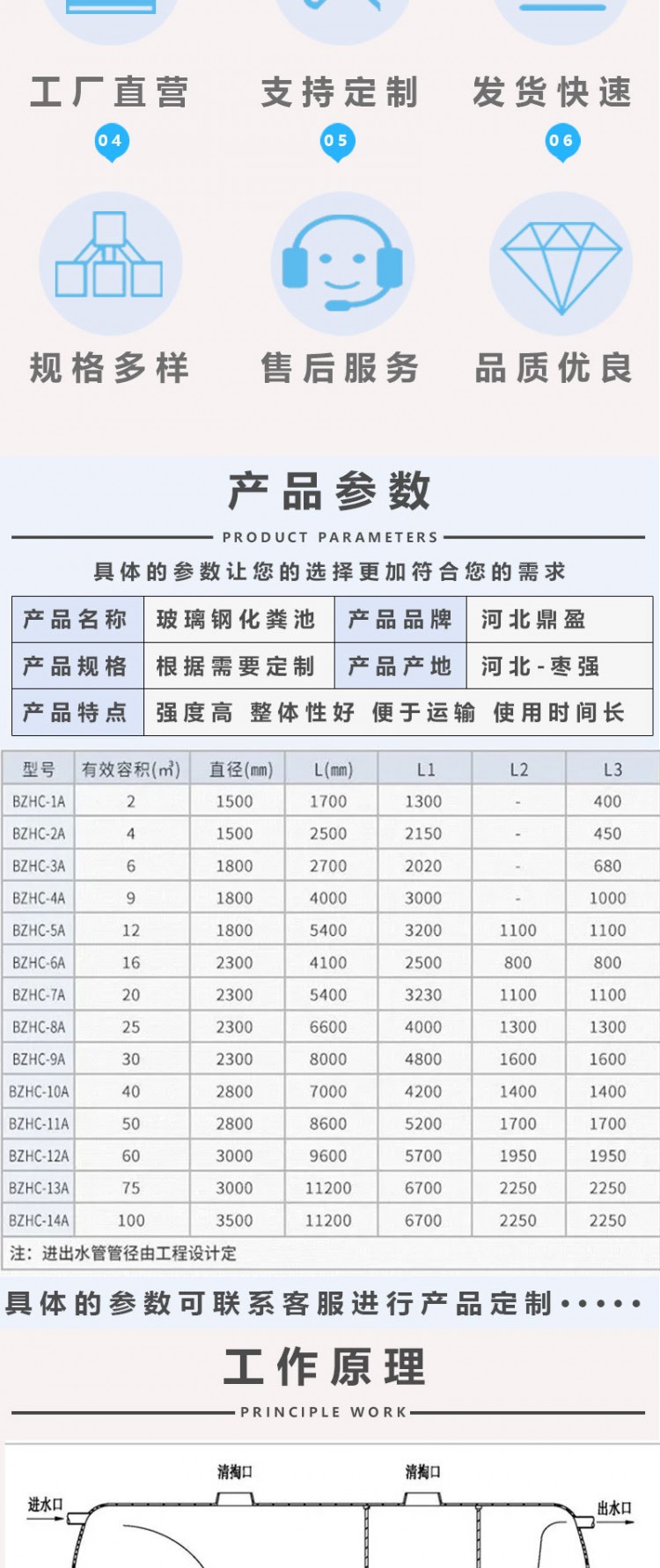 3、預(yù)制化糞池價(jià)格合理,造價(jià)低于國(guó)家預(yù)算造價(jià),根據(jù)設(shè)計(jì)容量自由增減組合,不需設(shè)計(jì)化糞池施工圖,節(jié)省時(shí)間、、節(jié)約設(shè)計(jì)費(fèi)。施工周期短施工費(fèi)用低。