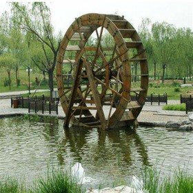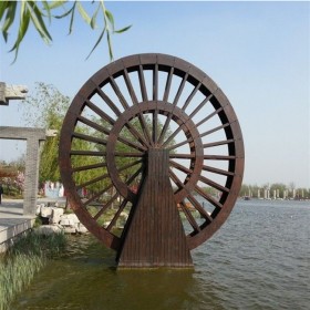 現(xiàn)如今隨著科技的發(fā)展,水車已經(jīng)不再常用于灌溉農(nóng)田,許多的景觀設(shè)計師通過筒車原理設(shè)計成一種裝飾景觀,逐漸便發(fā)展成我們?nèi)缃裨诰皡^(qū)見到的防腐木水車。防腐木水車一般由炭化木制成,炭化木是在不含化學(xué)劑的條件下應(yīng)用高溫對木材進行炭化處理。炭化木的含水率低,不易吸水,隔熱性好,不易變形。且施工簡單,涂刷方便。炭化木防腐爛,抗蟲蛀抗變形的特點讓它成為了水上景觀的理想材料。