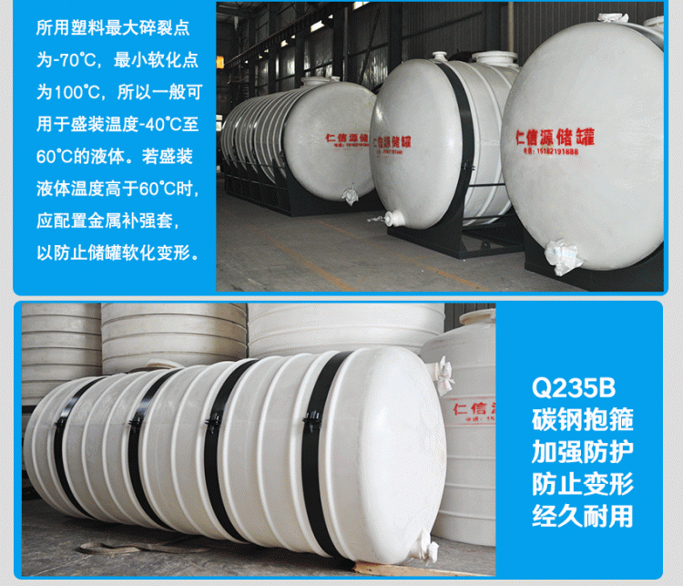 6、 塑料儲(chǔ)罐、聚乙烯水箱內(nèi)存溶液溫度一般為常溫。若盛裝液體溫度高于80℃時(shí),應(yīng)配置金屬補(bǔ)強(qiáng)套,以防防腐儲(chǔ)罐、PE水箱軟化變形,補(bǔ)強(qiáng)套松緊以不掉落為宜。
