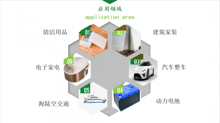 產(chǎn)品用途:汽車電池pack包;電子電器隔熱降噪;建筑吸音;軌道交通內(nèi)飾;航空工業(yè);船舶工業(yè);家用魔力清潔擦等。三聚氰胺海綿可根據(jù)不同需求定制高密度型,低甲醛型,疏水憎水型以及后加工型產(chǎn)品。