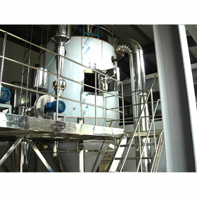 空氣經(jīng)過(guò)濾和加熱,進(jìn)入干燥器頂部空氣分配器,熱空氣呈螺旋狀均勻地進(jìn)入干燥室。料液經(jīng)塔體頂部的高速離心霧化器,(旋轉(zhuǎn))噴霧成極細(xì)微的霧狀液珠,與熱空氣并流接觸在極短的時(shí)間內(nèi)可干燥為成品。成品連續(xù)地由干燥塔底部和旋風(fēng)分離器中輸出,廢氣由風(fēng)機(jī)排空。