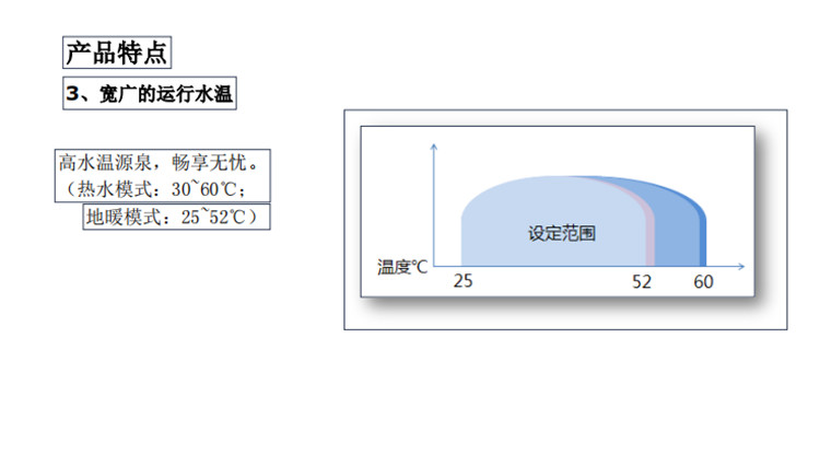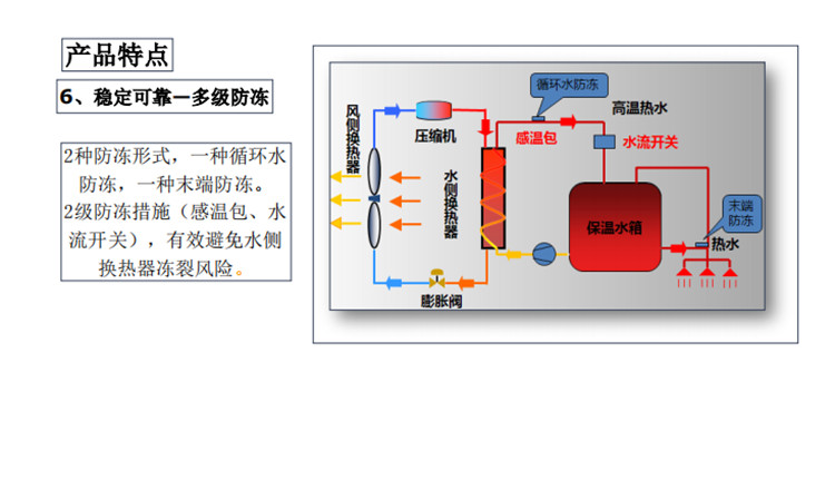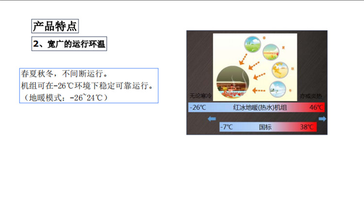 詳細(xì)信息 格力“紅冰”商用空氣能熱水機(jī)組,-26℃超低溫制取熱水,高出水溫度可達(dá)70℃,高溫?zé)崴h(huán)境不利于細(xì)菌滋生,全天候、連續(xù)的為酒店、賓館、醫(yī)院、洗浴中心等場(chǎng)所提供熱水。機(jī)組在低溫環(huán)境下具有高制熱量與能效比,減少碳排放量,“紅冰”商用空氣能熱泵熱水機(jī)組可結(jié)合太陽(yáng)能一起應(yīng)用,讓你的生活節(jié)能、環(huán)保。同時(shí),在相同的熱水需求條件下,出水溫度越高,所需水箱容積越小,越節(jié)省安裝空間。