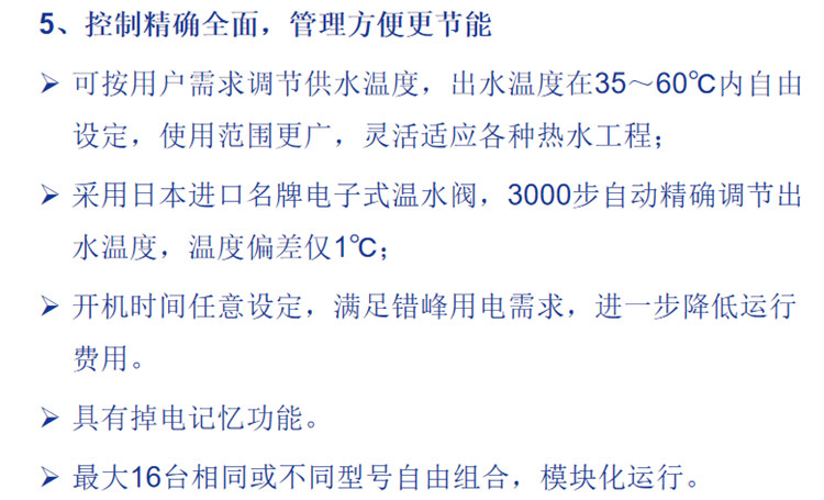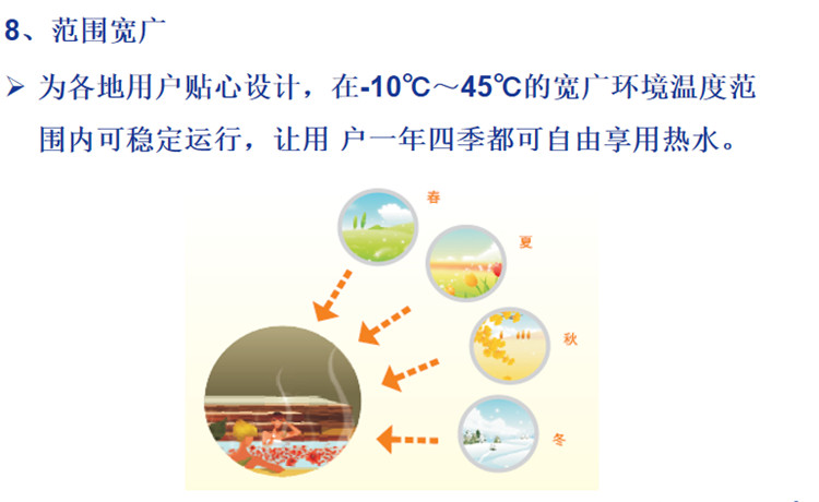 1、運(yùn)行范圍寬廣,-7~43℃的寬廣環(huán)境溫度范圍內(nèi)可穩(wěn)定運(yùn)行,讓用戶一年四季都安心享用熱水。出水溫度30~58℃靈活可設(shè),根據(jù)用戶需求隨心設(shè)定,滿足用戶不同的個(gè)性化要求。