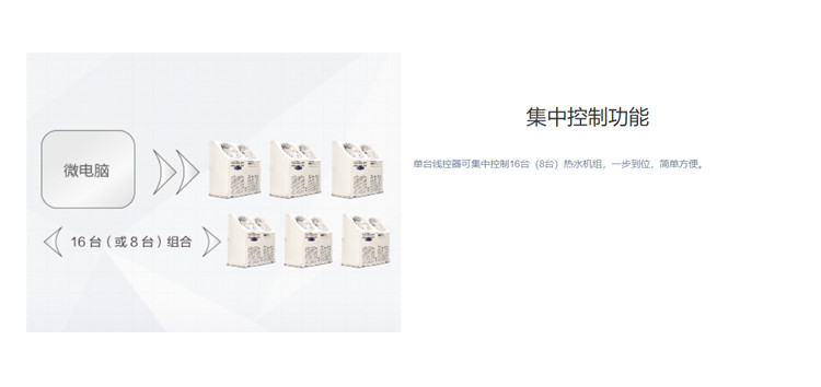 3、自由組合,設(shè)計、安裝靈活多變,集中控制功能,單臺線控器可集中控?16臺熱水機組,輕松便捷、簡單方便。
