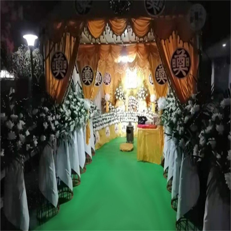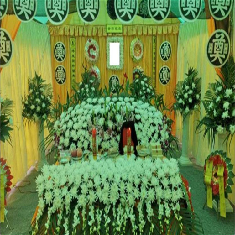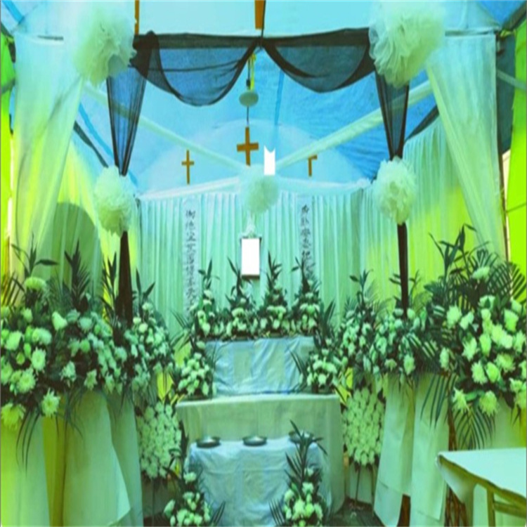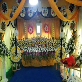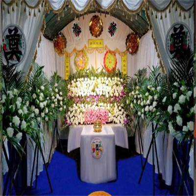 首先,靈堂搭建講究莊嚴(yán)肅穆的環(huán)境氛圍,現(xiàn)多以花圈或花籃作為裝飾。靈堂搭建的正面后方墻壁上方懸掛挽聯(lián),挽聯(lián)中間放置死者遺像,然后兩側(cè)用鮮花圍繞,遺像下方的香案上需擺設(shè)供品,包括有油燈(不斷加油,使其不熄滅,尤其是守靈的時(shí)候特別需要注意),香爐一具(供插入一炷香),香燭一對(duì),供果、供菜等。另外,如若有親人或朋友贈(zèng)送的花圈,可置于兩側(cè)以八字形依次排開陳列。