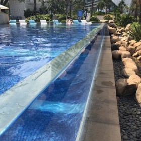 所謂的透明泳池,其實就是采用全透明玻璃做成的泳池。這種全新方式的泳池吸引了很多人的目光。而這種全透明玻璃,并非我們現(xiàn)實生活中常見的玻璃或者鋼化玻璃,而是厚度達到10CM--20CM的高透光亞克力玻璃。