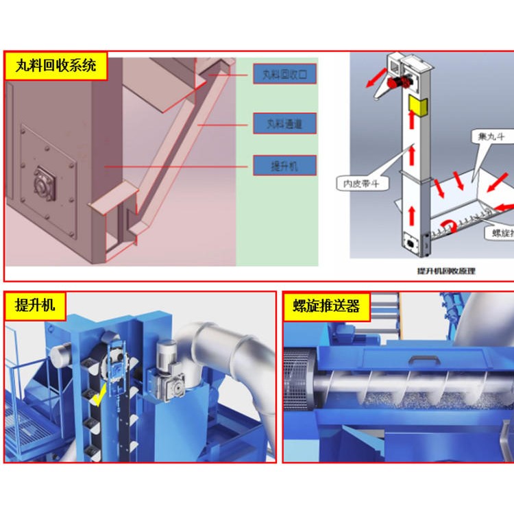2. 提升機皮帶采用抗撕裂合成纖維制成,刮砂斗采用1.2mm厚耐磨合金鋼經(jīng)一次沖壓成型,重量輕,減輕了提升電機負(fù)擔(dān),更加節(jié)能。丸料提升回收系統(tǒng),由減速電機驅(qū)動,包括帶輪、特制平帶、合金刮砂斗、減速電機等。