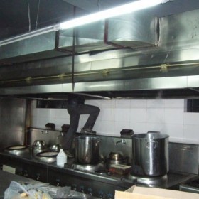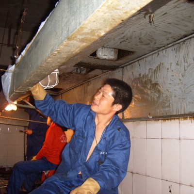 煙道清洗內(nèi)容包括煙罩表面、煙罩內(nèi)的燈罩、排風(fēng)口、排煙口以及電機(jī)、灶臺表面。煙道清洗的重點(diǎn)是排煙口與煙罩相連處并和煙罩同步平行的排煙道。重點(diǎn)對平行煙道內(nèi)部進(jìn)行徹底清潔。采用的主要方法是專業(yè)人員進(jìn)入煙道內(nèi)部進(jìn)行清潔。對于排煙口窄小,無法進(jìn)入煙道或由于煙道走身狹窄、觸及不到無法進(jìn)行清潔,但又存在著重大隱患的,本公司可利用特殊設(shè)備進(jìn)行清潔,不留死角,并可拍攝清潔前后的對比照片,打消客戶的疑慮和擔(dān)心,消除一切潛在的火災(zāi)隱患。風(fēng)機(jī)、風(fēng)柜與煙道連接的方法一般有兩種情況:一種是用帆布相連的軟連接,而另一種是直接與煙道相連的硬連接??商峁└鼡Q風(fēng)機(jī)、風(fēng)柜連接帆布的服務(wù)。如果是煙道硬連接,我們將與風(fēng)機(jī)、風(fēng)柜相連的煙道進(jìn)行徹底清潔。