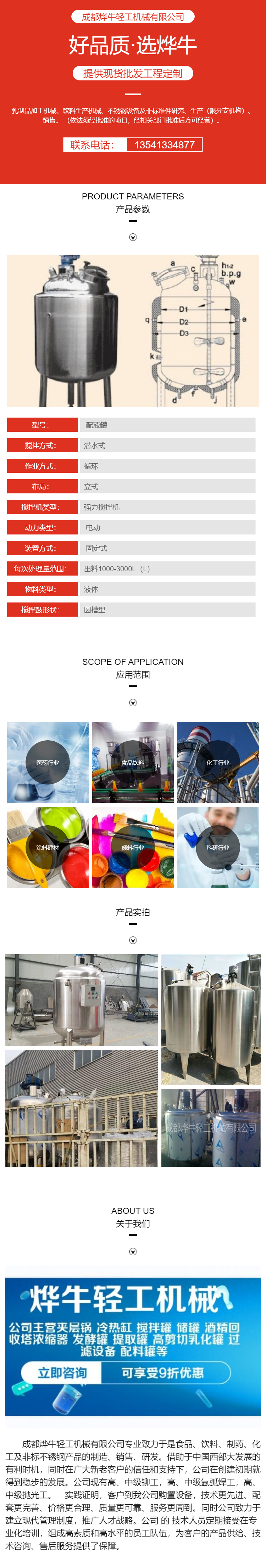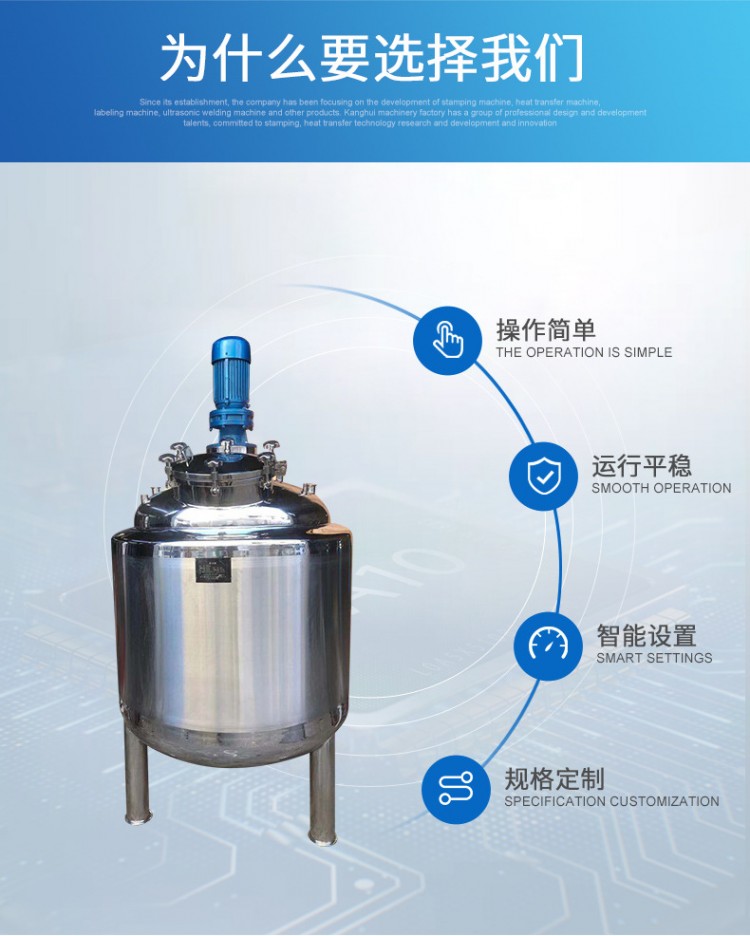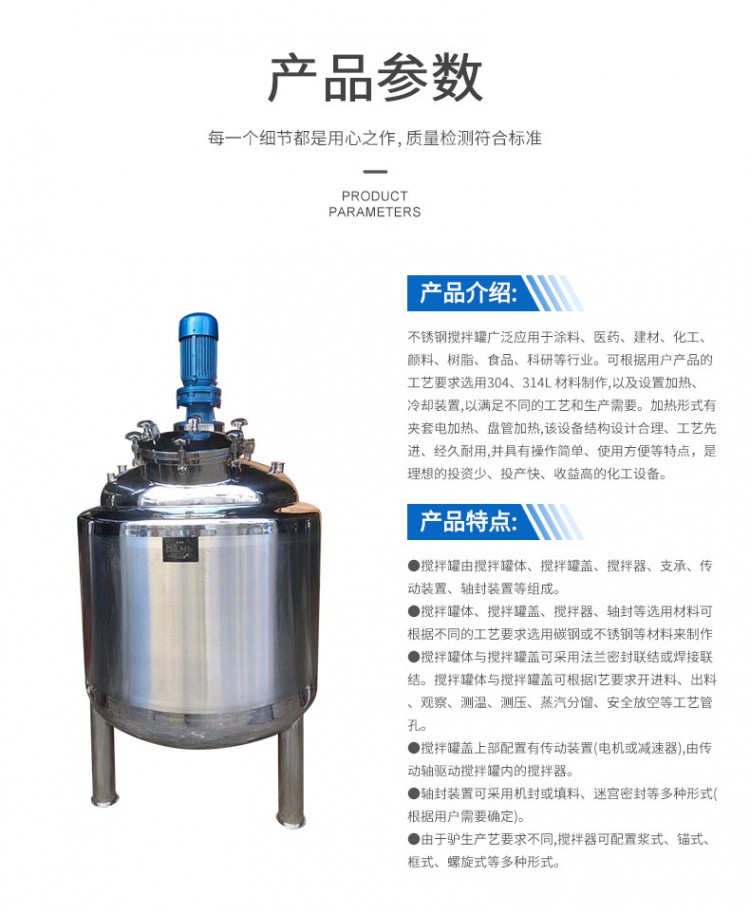 攪拌罐的結(jié)構(gòu):攪拌罐由攪拌罐體、攪拌罐蓋、攪拌器、支承、傳動(dòng)裝置、軸封裝置等組成,還可根據(jù)工藝要求配置加熱裝置或冷卻裝置。攪拌罐體、攪拌罐蓋、攪拌器、軸封等選用材料可根據(jù)不同的工藝要求選用碳鋼或不銹鋼等材料來制作。攪拌罐體與攪拌罐蓋可采用法蘭密封聯(lián)結(jié)或焊接聯(lián)結(jié)。攪拌罐體與攪拌罐蓋可根據(jù)工藝要求開進(jìn)料、出料、觀察、測(cè)溫、測(cè)壓、蒸汽分餾、安全放空等工藝管孔。攪拌罐蓋上部配置有傳動(dòng)裝置(電機(jī)或減速器),由傳動(dòng)軸驅(qū)動(dòng)攪拌罐內(nèi)的攪拌器。軸封裝置可采用機(jī)封或填料、迷宮密封等多種形式(根據(jù)用戶需要確定)。由于用戶生產(chǎn)工藝要求不同,攪拌器可配置漿式、錨式、框式、螺旋式等多種形式。如有其他要求可與本廠聯(lián)系,另行設(shè)計(jì)制作。