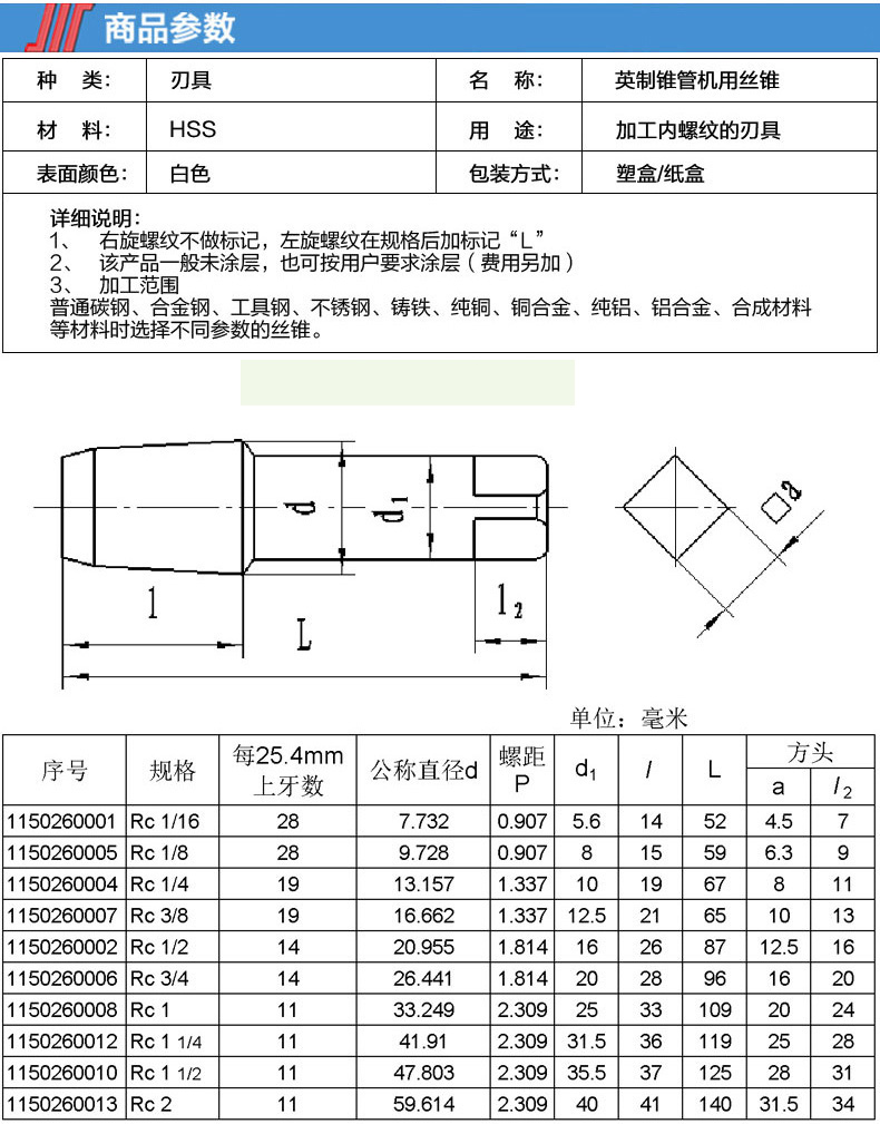 成量 高性能英制錐管機用絲錐 Rc 1/16 RC