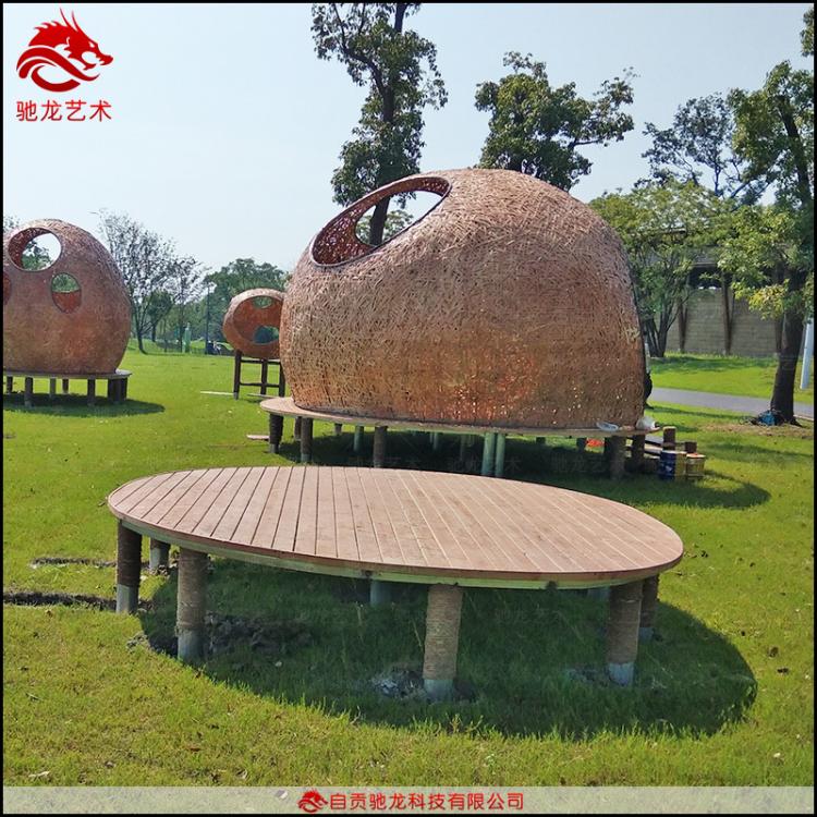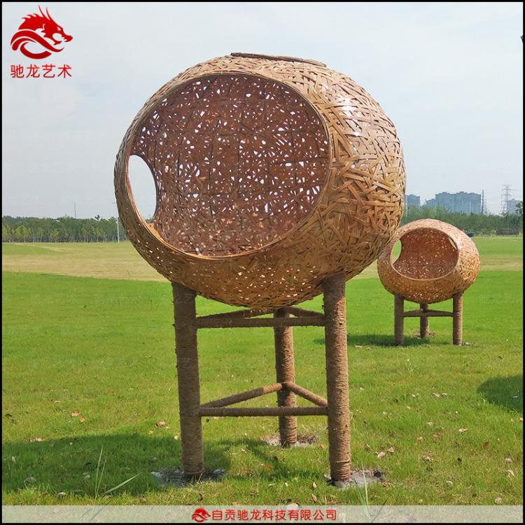 竹編造景藝術(shù)定制竹藝編織異形造型裝置定做景區(qū)公園藝術(shù)休息亭制作公司,竹編藝術(shù)裝置制作的設(shè)計理念為,竹與景融為一體,營造“人在竹境內(nèi),猶在輕風(fēng)中”,令人心生向往。然而它亦如圍城,向外擁抱自然,向內(nèi)窺得自然的方寸之美。結(jié)構(gòu)設(shè)計上,以天地方圓為中心,遵循可行性原則的基礎(chǔ)上,也充分展現(xiàn)柔韌的竹性。