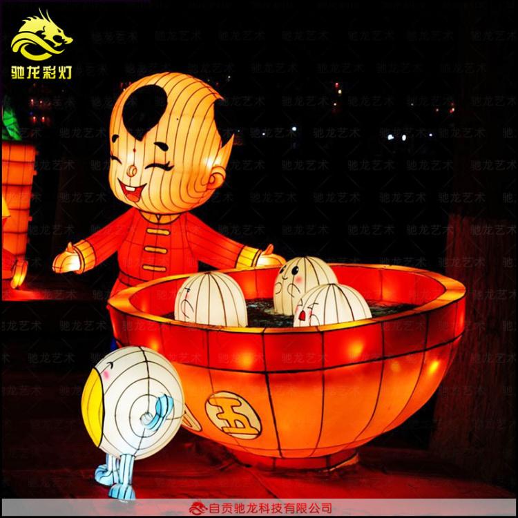 善財(cái)童子招財(cái)裝飾物花燈籠定做大型造型燈籠彩燈傳統(tǒng)布藝花燈美陳,相傳兩千多年前西漢時(shí)期,漢武帝在皇宮設(shè)壇祭祀當(dāng)時(shí)天神中尊貴的太一神,由于徹夜舉行,必須終夜點(diǎn)燈照明,此為春節(jié)元宵節(jié)燈會(huì)展覽開(kāi)端。后在佛教自印度傳人中土后,由于道教神仙術(shù)與佛教燃燈禮佛的虔誠(chéng)互相結(jié)合,每到春節(jié)元宵節(jié)至正月,城鄉(xiāng)燈火通明,土族庶民一律掛燈,形成一個(gè)中西合璧的獨(dú)特景象。