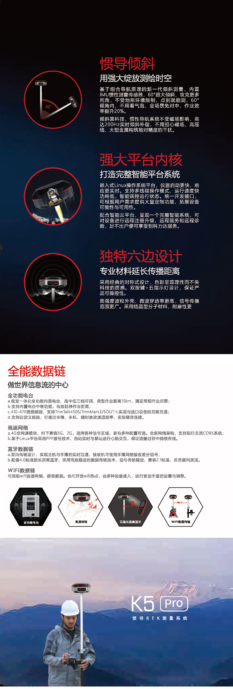 基于組合導(dǎo)航原理的新一代傾斜測(cè)量,內(nèi)置IMU慣性測(cè)量傳感器,60° 超大傾斜,攻克更多死角,不受地形環(huán)境限制,點(diǎn)到就能測(cè),60 °傾角內(nèi),不用看氣泡,全場(chǎng)景免對(duì)中,作業(yè)效率提升20%。