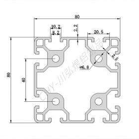 2、 參數(shù):8080歐標(biāo)工業(yè)鋁型材壁厚2.5mm, 槽口8.2mm,內(nèi)孔6.8mm.