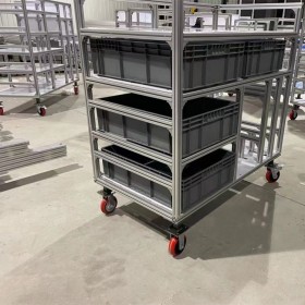 2、 產(chǎn)品特點(diǎn):該定制的可移動(dòng)物料周轉(zhuǎn)車,由4040歐標(biāo)型材及角碼組裝而成,每層放有物料框方便拿貨,底部帶滑輪可移動(dòng)。