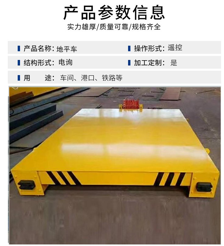 產(chǎn)品參數(shù) 產(chǎn)品名稱:軌道式平板運(yùn)輸車 廠區(qū)車間貨物搬運(yùn) 蓄電池低壓電動(dòng)平車