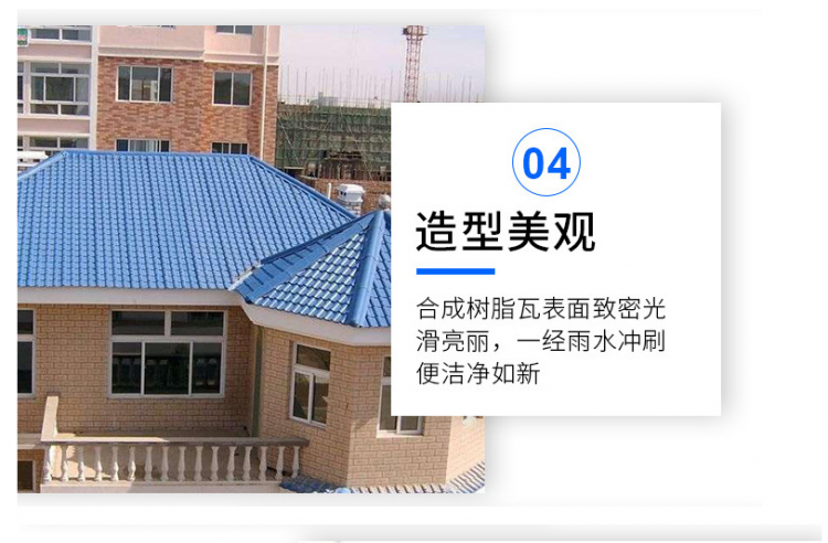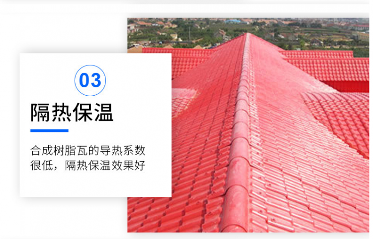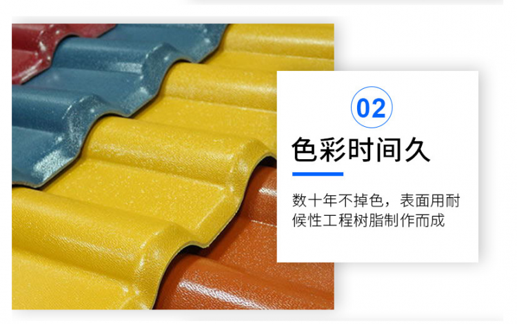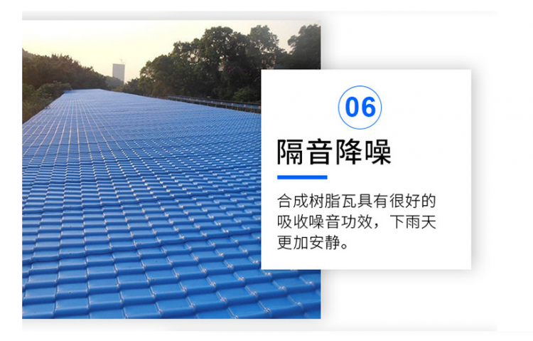 合成樹脂瓦具有良好的承載能力。在溫度較低的地區(qū),即使屋頂常年積雪,合成樹脂瓦不會產(chǎn)生表面損壞及斷裂現(xiàn)象。經(jīng)測試,在支撐間距660mm的情況下,加載150K,瓦不會產(chǎn)生裂痕和損壞。經(jīng)試驗證明:在遭受暴雨、大風(fēng)等外界噪音影響時,裕安合成樹脂瓦具有很好的吸收噪音。