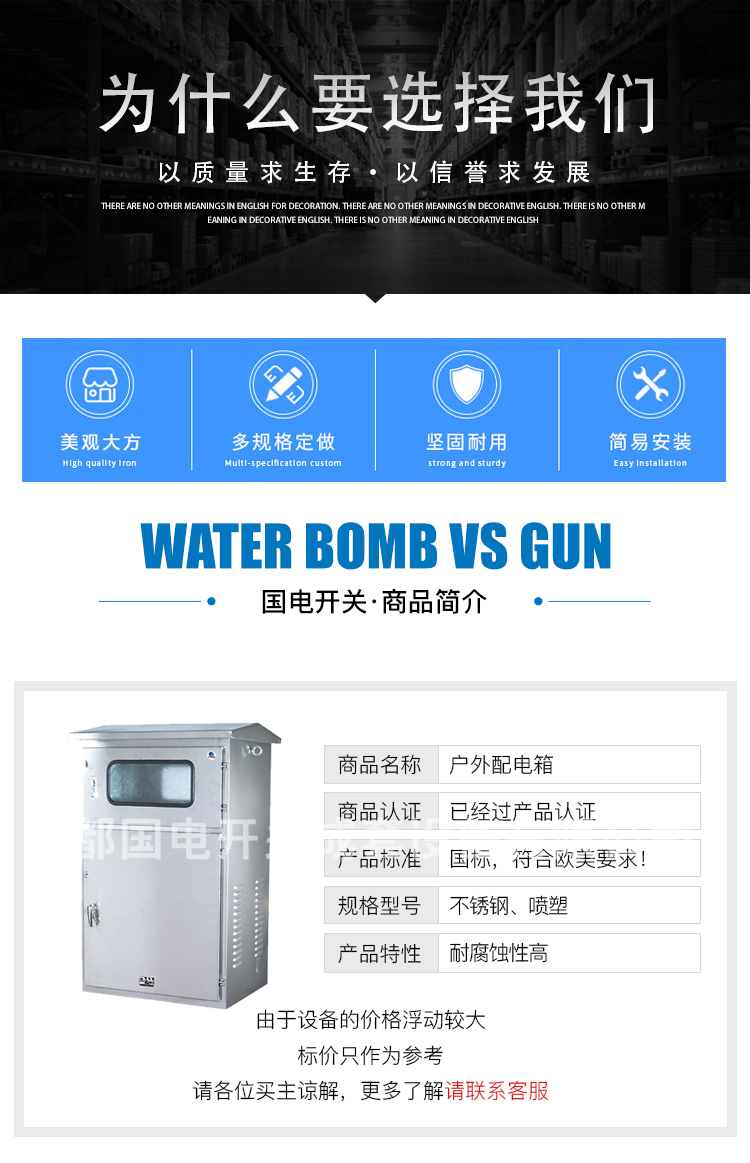詳細(xì)信息 戶外配電箱廣泛用于賓館、公寓、高層建筑、港口、車站、機(jī)場、倉庫、醫(yī)院和廠礦企業(yè)等單位的建筑照明和小型動(dòng)力控制電路中,適用于交流50Hz,交流單相240V、三相450V及以下,電流250A及以下的戶內(nèi)照明和動(dòng)力配電線路中,作為線路過載保護(hù)、短路保護(hù)以及線路切換用,該型設(shè)備適用于民用或適合于非專業(yè)人員可進(jìn)入場地使用。