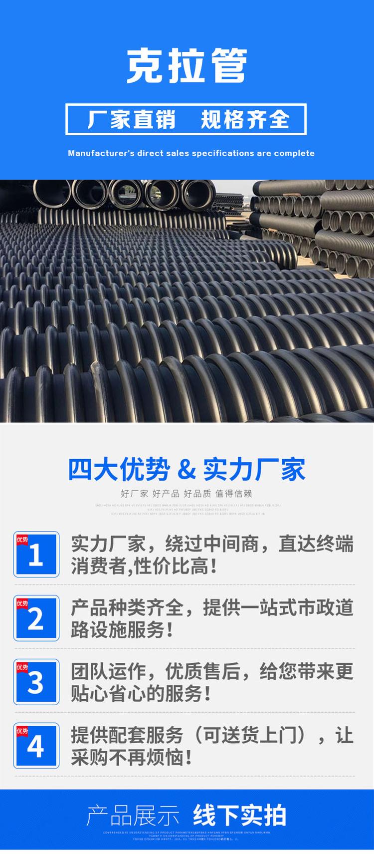 克拉管產(chǎn)品可分為PR、OP、SQ、VW四種系列,其中: PR、OP-主要用做埋地排水管道, SQ-主要用于制造容器或窨井, VW-主要用于三通、彎頭、二次加工成型的管件, 產(chǎn)品中應(yīng)用更多的是PR系列,該產(chǎn)品內(nèi)表面光滑、外部為異型增強結(jié)構(gòu),管材標(biāo)準(zhǔn)長度為6米,管內(nèi)徑范圍為DN300-DN4000,產(chǎn)品指標(biāo) 均達到GB/T 19472. 2-2017 B型結(jié)構(gòu)壁管標(biāo)準(zhǔn)及EN-13476歐洲標(biāo)準(zhǔn)要求。