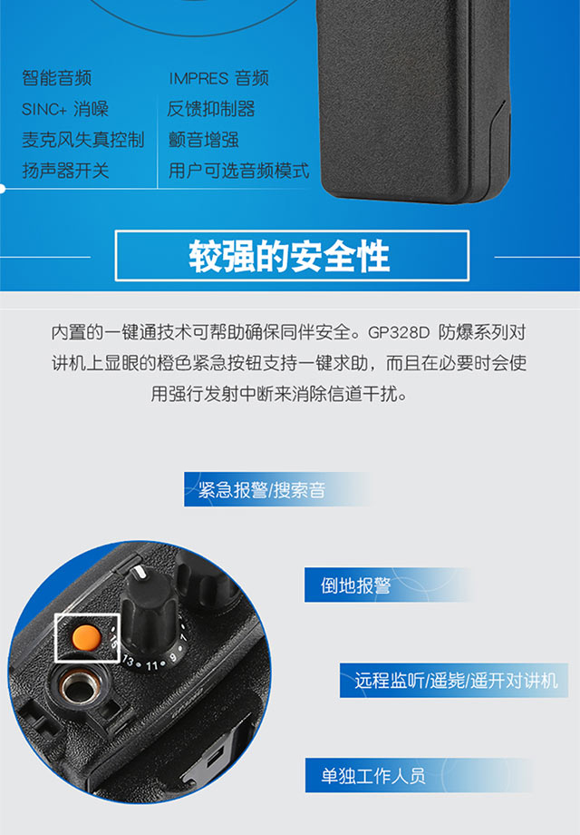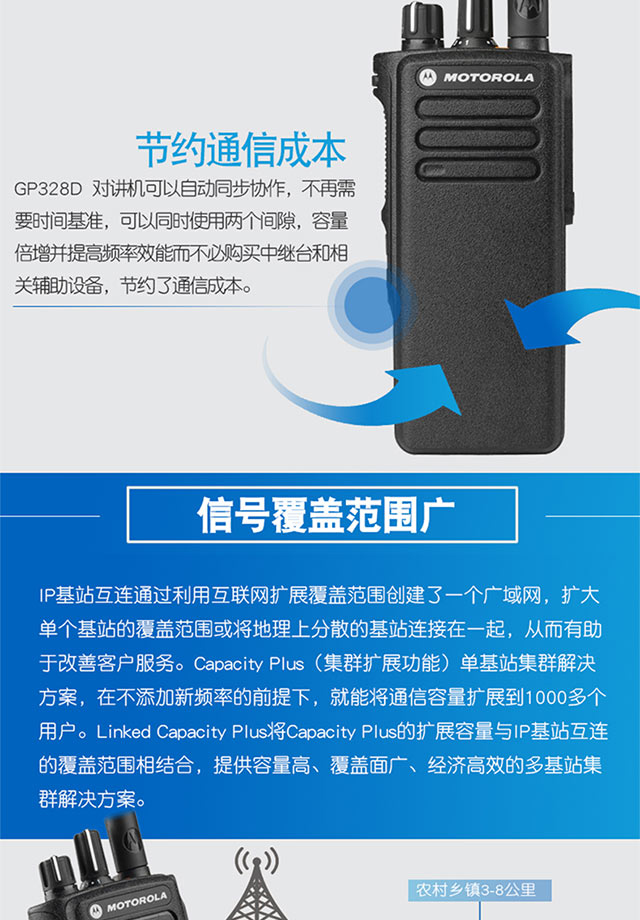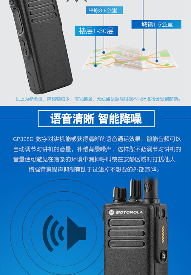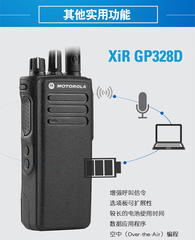 通話聲音響亮、清楚的通話效果使用戶即使在嘈雜的環(huán)境下也能保持順暢通訊。32個信道允許用戶將自己的工作團隊分成不同的通話組,從而提高無線電通訊的靈活性。專線 (PL) 和數(shù)字專線 (DPL) 功能有助于防止同一頻率上出現(xiàn)外界干擾通話。摩托羅拉GP328D超長的電池壽命可以使用戶的通話時間長達8小時以上。并且有LED指示燈和音頻提示音可以提醒用戶電池電量不足。