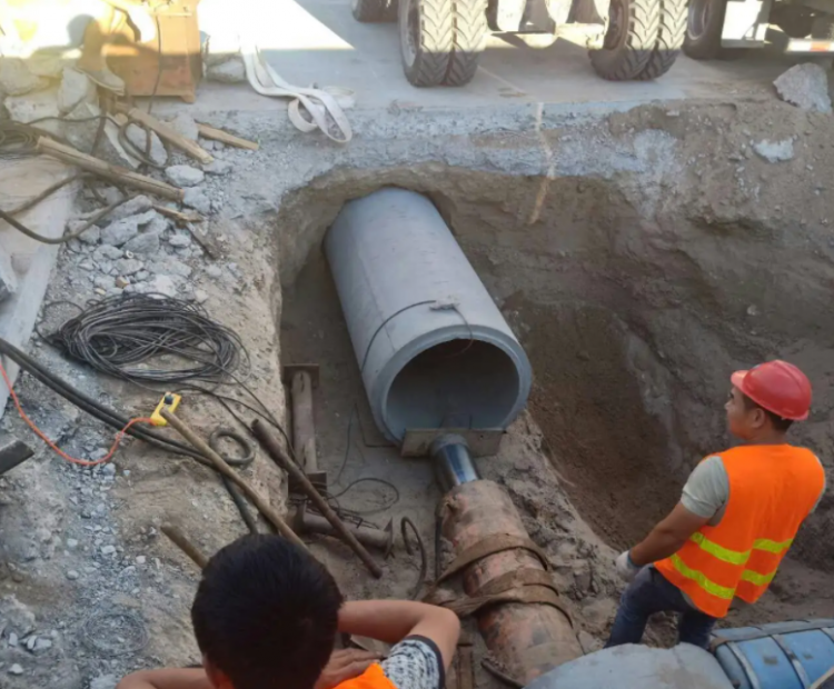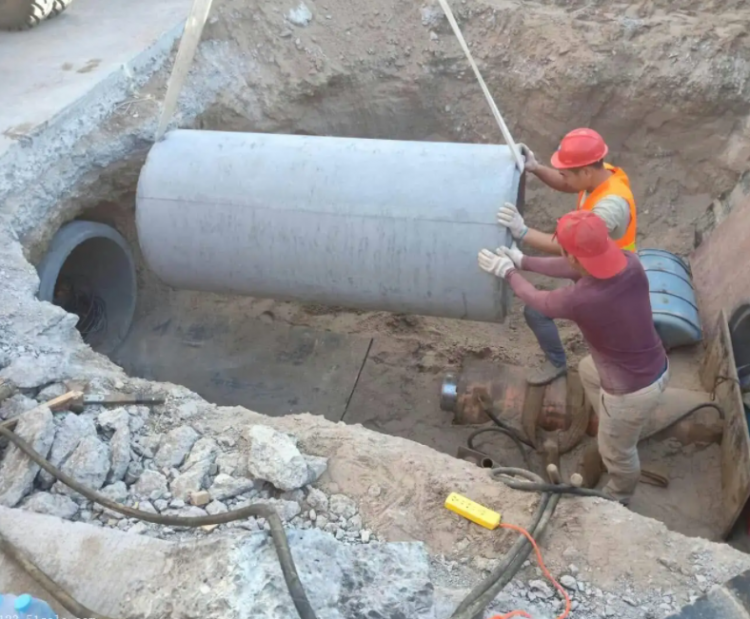 3,機械開挖管溝槽,邊坡1:0.25,機械吊裝管就位。 管道溝槽開挖后,必須進行溝槽地基承載力測定,測定采用重型擊實法進行測定,地基承載能力滿足設計要求后方可澆注混凝土墊層,如地基承載能力不滿足設計要求,必須采取回填碎石墊層的方式進行處理,處理后再進行地基承載能力確定。