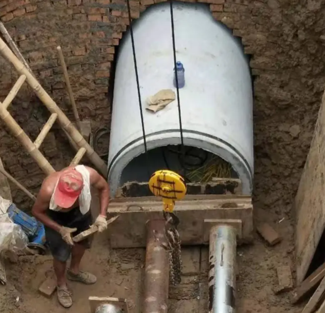 6,待枕基混凝土達到設計強度后,將管道吊裝到枕基上, 并用紅磚固定其位置確保兩管道的中心線一致,保證管道軸線在同一直線上,不允許管道中心線交錯。
