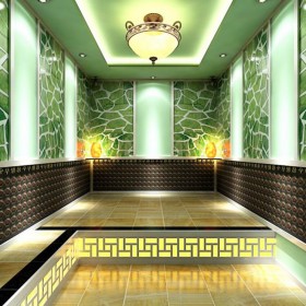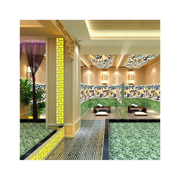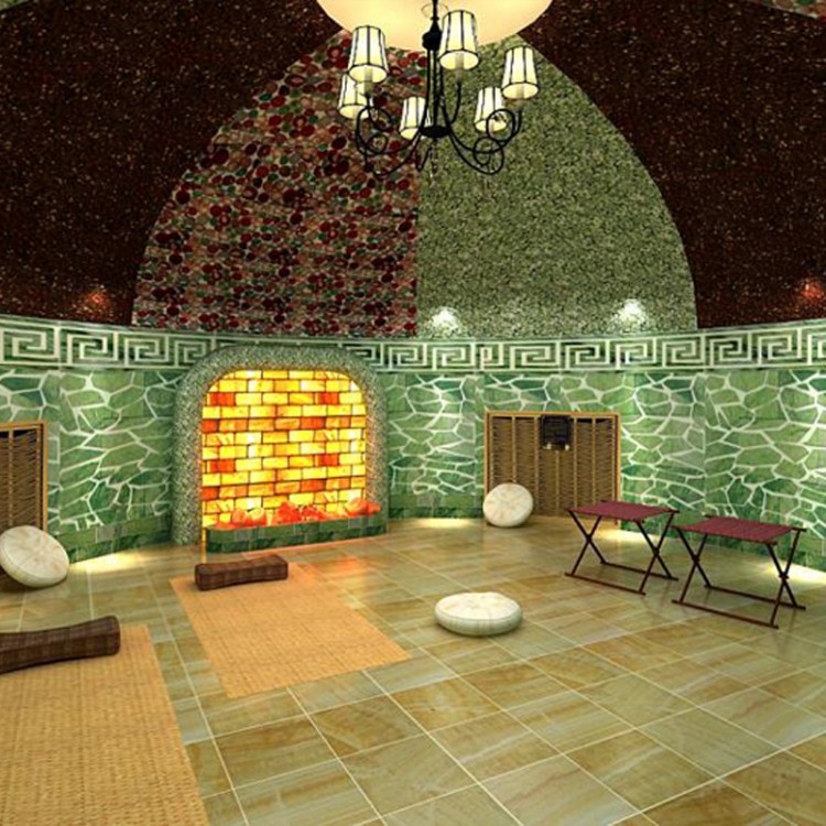 頂棚用天然原木,沒(méi)有經(jīng)過(guò)任何油漆色彩加工,簡(jiǎn)約大方,墻面和地面用天然玉石裝飾,天然的玉石的好處很多。主要有以下3點(diǎn)