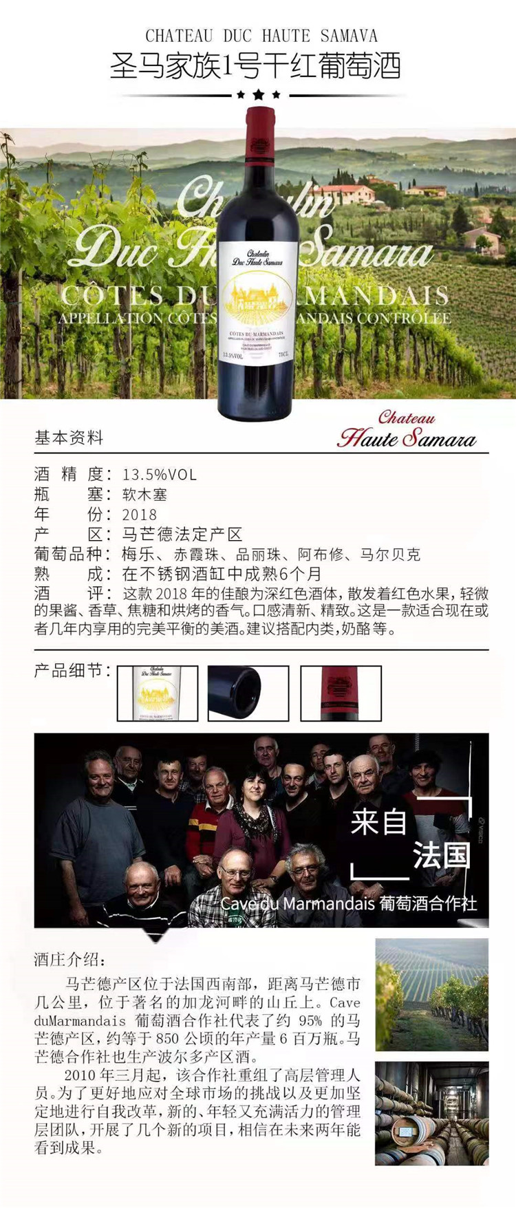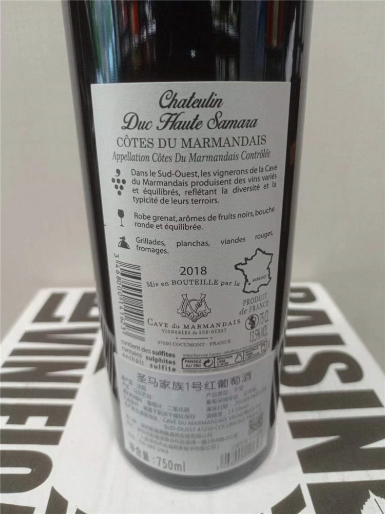| 產(chǎn)區(qū);馬爾芒臺 佇藏條件;情置于陰涼干燥處保存 混裝日期;2019年4月12日 產(chǎn)品類型;干型 酒精度;13.5%VOL 保質(zhì)期;10年 規(guī)格;750ml 生產(chǎn)商及灌裝地址;CAVE DU MARMANDAIS VIGNOBLES DU SUD-OUEST 47250 COCUMONT FRAN CE |