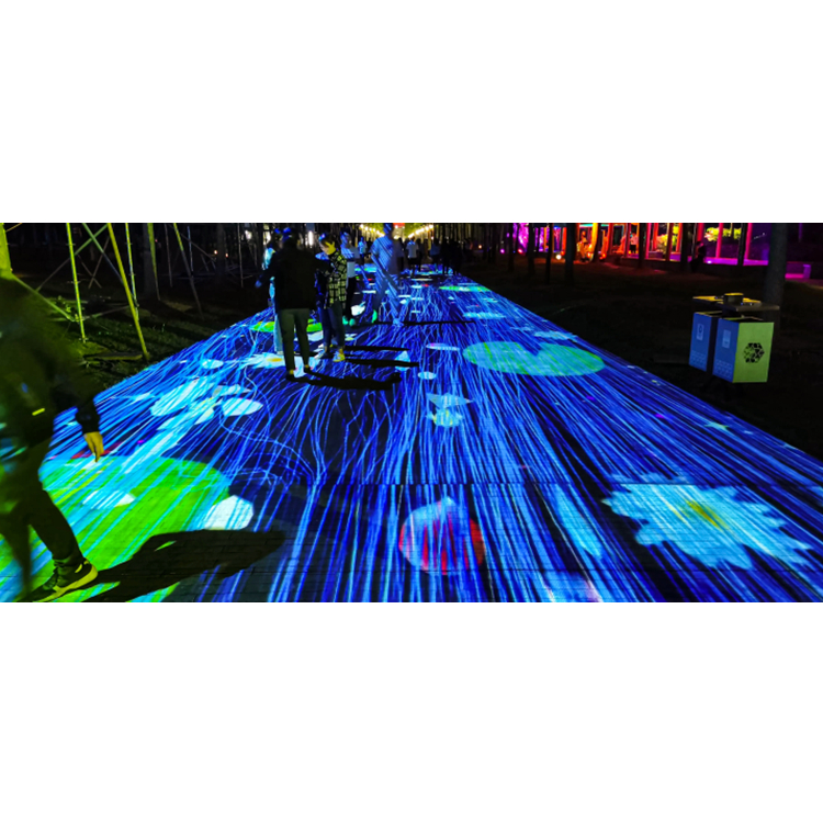 詳細(xì)信息 地面互動(dòng)投影系統(tǒng)系統(tǒng)采用懸掛在頂部的投影設(shè)備把影像效果投射到地面,當(dāng)參訪者走至投影區(qū)域時(shí),通過系統(tǒng)識別,參訪者可以直接使用雙腳或動(dòng)作與投影幕上的虛擬場景進(jìn)行交互,各種互動(dòng)效果就會(huì)隨著你的腳步產(chǎn)生相應(yīng)的變幻。