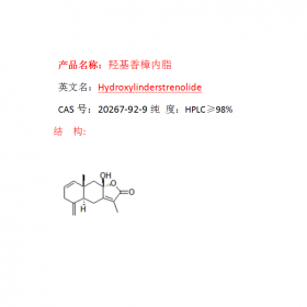 中文名稱 羥基香樟內(nèi)脂 中文別名 無(wú) 英文名 Hydroxylinderstrenolide 英文別名 無(wú) 分子式 C15H18O3 分子量 246.30 CAS登錄號(hào) 20267-92-9 提取來(lái)源 烏藥 化學(xué)結(jié)構(gòu) 外觀 白色晶體 NMR,MS 4℃冷藏、密封、避光 2年 無(wú) 鑒別方法 NMR,MS 貯存條件 4℃冷藏、密封、避光 有效期 2年 注意事項(xiàng) 無(wú) 溶解性 溶于氯仿,甲醇 測(cè)定方法 補(bǔ)充中 藥典測(cè)定方法 無(wú) 用途 用于含量測(cè)定/鑒定/藥理實(shí)驗(yàn)等 ▎相關(guān)文獻(xiàn): 點(diǎn)擊查看完整文獻(xiàn) ▎相關(guān)產(chǎn)品: 編號(hào) 中文名稱 英文名稱 CAS登陸號(hào) 純度 規(guī)格 A1339 羥基香樟內(nèi)脂 Hydroxylinderstrenolide 20267-92-9 ≥ 98% 10mg/支 A1326 氧化烏藥醚內(nèi)酯 Linderanine C 139681-96-2 ≥ 98% 5mg/支 A1321 烏藥內(nèi)酯 Linderalactone 728-61-0 ≥ 98% 20mg/支 A1320 烏藥醇 Lindenenol 26146-27-0 ≥ 98% 20mg/支 A1319 乙酰烏藥酯 Lindenenyl acetate 26146-28-1 ≥ 98% 20mg/支 A0538 去甲異波爾定 Norisoboldine 23599-69-1 ≥ 98% 20mg/支 A0458 異烏藥內(nèi)酯 Isolinderalactone 957-66-4 ≥ 98% 20mg/支 A0367 烏藥醚內(nèi)酯 Linderane 13476-25-0 ≥ 98% 20mg/支
