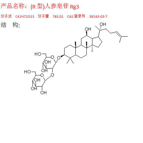 中文名稱 20(R)人參皂苷Rg3 中文別名 20(R)人參皂甙Rg3 英文名 20(R)Ginsenoside Rg3 英文別名 beta-D-Glucopyranoside,(3beta,12beta)-12,20-dihydroxydammar-24-en-3-yl 2-O-beta-D-glucopyranosyl;GINSENOSIDE RG3;R-form-Ginsenoside Rg3 分子式 C42H72O13 分子量 785.01 CAS登錄號(hào) 38243-03-7 提取來源 五加科植物人參Panax ginseng C.A.Mey.的根 化學(xué)結(jié)構(gòu) 外觀 白色粉末 鑒別方法 NMR; MS 貯存條件 4℃冷藏、密封、避光有效期 2年 注意事項(xiàng) 無溶解性 可溶于水,不溶于石油mi、lv fang。 測定方法 補(bǔ)充中 藥典測定方法 補(bǔ)充中 用途 用于含量測定/鑒定/藥理實(shí)驗(yàn)等 ▎相關(guān)產(chǎn)品: 編號(hào) 中文名稱 英文名稱 CAS登陸號(hào) 純度 規(guī)格 A1038 人參黃酮苷 Panasenoside 31512-06-8 ≥92% 20mg/支 A1040 人參皂苷Ra3 Ginsenoside Ra3 90985-77-6 ≥98% 20mg/支 A1027 人參皂苷Ra2 Ginsenoside Ra2 83459-42-1 ≥ 95% 20mg/支 A1025 人參皂苷Ra1 Ginsenoside Ra1 83459-41-0 ≥98% 20mg/支 A0460 (R型)原人參二醇 20(R)Protopanaxdiol 補(bǔ)充中 ≥ 95% 20mg/支 A0251 人參三醇 Panaxatriol 32791-84-7 ≥ 98% 20mg/支 A0250 人參二醇 Panaxadiol 19666-76-3 ≥ 98% 20mg/支 A1363 人參皂苷Ra6 Ginsenoside Ra6 1346522-89-1 ≥ 98% 5mg/支 A1362 人參皂苷Rs1 Ginsenoside Rs1 87733-67-3 ≥ 98% 5mg/支 A1361 20-葡萄糖基-人參皂苷Rf 20-gluco-ginsenoside Rf 68406-27-9 ≥ 98% 10mg/支 A1343 西洋參皂苷R1 Quinquenoside R1 85013-02-1 ≥88% 10mg/支 A1340 人參皂苷Rs2 Ginsenoside Rs2 87733-66-2 ≥ 98%和≥ 97% 20mg/支 A1008 越南參皂苷R8 vina-ginsenoside R8 156042-22-7 ≥98% 10mg/支 A1007 越南參皂苷R4 vina-ginsenoside R4 156009-80-2 ≥98% 20mg/支 A1005 越南參皂苷R3 vina-ginsenoside R3 156012-92-9 ≥94% 10mg/支 A0997 三七皂苷Fe Notoginsenoside Fe 88105-29-7 ≥98% 20mg/支 A1016 人參皂苷Rk3 Ginsenoside Rk3 364779-15-7 ≥90% 10mg/支 A1015 人參皂苷Rk2 Ginsenoside Rk2 364779-14-6 ≥68%(UV), 80%(ELSD) 10mg/支 A0775 人參皂苷Rk1 Ginsenoside Rk1 494753-69-4 ≥ 98%(此物質(zhì)極不穩(wěn)定,僅供定性用) 10 mg/支 A0774 人參皂苷Rg6 Ginsenoside Rg6 147419-93-0 ≥ 90% 20 mg/支 A0994 人參皂苷Rg5 Ginsenoside Rg5 186763-78-0 ≥98% 10mg/支 A0522 人參皂苷Ro Ginsenoside Ro 34367-04-9 ≥ 98% 20mg/支 A0248 原人參二醇 Protopanaxdiol 30636-90-9 ≥ 98% 20mg/支 A0450 人參皂苷CK Ginsenoside CK 39262-14-1 ≥ 98% 20 mg/支