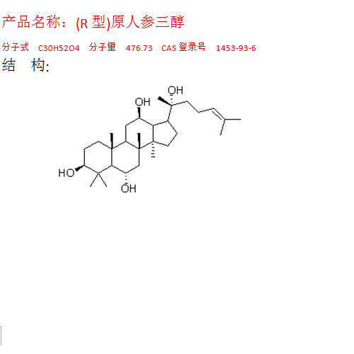 中文名稱 20(R)原人參三醇 中文別名 補(bǔ)充中 英文名 20(R)Protopanaxatriol 英文別名 (20R)-5α-Dammar-24-ene-3β,6α,12β,20-tetrol;(20R)-Dammar-24-ene-3β,6α,12β,20-tetrol;(20R)-Protopanaxatriol 分子式 C30H52O4 分子量 476.73 CAS登錄號 1453-93-6 提取來源 五加科植物人參Panax ginseng C. A. Mey.的干燥根 化學(xué)結(jié)構(gòu) 外觀 白色粉末 鑒別方法 NMR; MS 貯存條件 4℃冷藏、密封、避光 有效期 2年 注意事項(xiàng) 無溶解性 可溶于甲醇、丙酮、DMSO等溶劑。 測定方法 補(bǔ)充中 藥典測定方法 補(bǔ)充中 用途 用于含量測定/鑒定/藥理實(shí)驗(yàn)等 ▎相關(guān)產(chǎn)品: 編號 中文名稱 英文名稱 CAS登陸號 純度 規(guī)格 A1038 人參黃酮苷 Panasenoside 31512-06-8 ≥92% 20mg/支 A1040 人參皂苷Ra3 Ginsenoside Ra3 90985-77-6 ≥98% 20mg/支 A1027 人參皂苷Ra2 Ginsenoside Ra2 83459-42-1 ≥ 95% 20mg/支 A1025 人參皂苷Ra1 Ginsenoside Ra1 83459-41-0 ≥98% 20mg/支 A0460 (R型)原人參二醇 20(R)Protopanaxdiol 補(bǔ)充中 ≥ 95% 20mg/支 A0251 人參三醇 Panaxatriol 32791-84-7 ≥ 98% 20mg/支 A0250 人參二醇 Panaxadiol 19666-76-3 ≥ 98% 20mg/支 A1363 人參皂苷Ra6 Ginsenoside Ra6 1346522-89-1 ≥ 98% 5mg/支 A1362 人參皂苷Rs1 Ginsenoside Rs1 87733-67-3 ≥ 98% 5mg/支 A1361 20-葡萄糖基-人參皂苷Rf 20-gluco-ginsenoside Rf 68406-27-9 ≥ 98% 10mg/支 A1343 西洋參皂苷R1 Quinquenoside R1 85013-02-1 ≥88% 10mg/支 A1340 人參皂苷Rs2 Ginsenoside Rs2 87733-66-2 ≥ 98%和≥ 97% 20mg/支 A1008 越南參皂苷R8 vina-ginsenoside R8 156042-22-7 ≥98% 10mg/支 A1007 越南參皂苷R4 vina-ginsenoside R4 156009-80-2 ≥98% 20mg/支 A1005 越南參皂苷R3 vina-ginsenoside R3 156012-92-9 ≥94% 10mg/支 A0997 三七皂苷Fe Notoginsenoside Fe 88105-29-7 ≥98% 20mg/支 A1016 人參皂苷Rk3 Ginsenoside Rk3 364779-15-7 ≥90% 10mg/支 A1015 人參皂苷Rk2 Ginsenoside Rk2 364779-14-6 ≥68%(UV), 80%(ELSD) 10mg/支 A0775 人參皂苷Rk1 Ginsenoside Rk1 494753-69-4 ≥ 98%(此物質(zhì)極不穩(wěn)定,僅供定性用) 10 mg/支 A0774 人參皂苷Rg6 Ginsenoside Rg6 147419-93-0 ≥ 90% 20 mg/支 A0994 人參皂苷Rg5 Ginsenoside Rg5 186763-78-0 ≥98% 10mg/支 A0522 人參皂苷Ro Ginsenoside Ro 34367-04-9 ≥ 98% 20mg/支 A0248 原人參二醇 Protopanaxdiol 30636-90-9 ≥ 98% 20mg/支 A0450 人參皂苷CK Ginsenoside CK 39262-14-1 ≥ 98% 20 mg/支