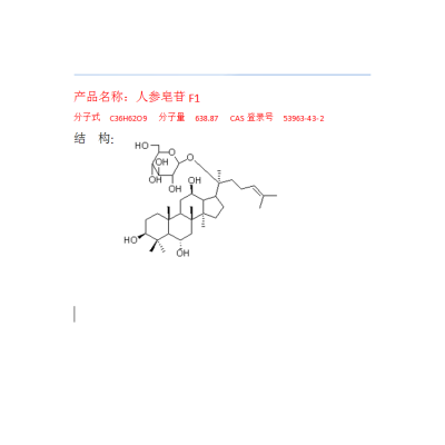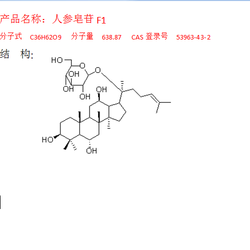 中文名稱 人參皂苷F1 中文別名 人參皂甙F1 英文名 Ginsenoside F1 英文別名 Panaxoside A progenin 分子式 C36H62O9 分子量 638.87 CAS登錄號(hào) 53963-43-2 提取來(lái)源 五加科植物人參Panax ginseng C. A. Mey.的干燥根 化學(xué)結(jié)構(gòu) 外觀 白色粉末 鑒別方法 NMR,MS 貯存條件 4℃冷藏、密封、避光 有效期 2年 注意事項(xiàng) 無(wú) 溶解性 易溶于水、甲醇、乙醇,不溶于yimi、beng。 測(cè)定方法 HPLC法,Spherisorb-C18半制備柱,以乙腈-水(30:70)為流動(dòng)相,檢測(cè)波長(zhǎng):302nm,流速為1ml/min,柱溫:室溫。 藥典測(cè)定方法 補(bǔ)充中 用途 用于含量測(cè)定/鑒定/藥理實(shí)驗(yàn)等 ▎相關(guān)文獻(xiàn): 點(diǎn)擊查看完整文獻(xiàn) 相關(guān)產(chǎn)品: 編號(hào) 中文名稱 英文名稱 CAS登陸號(hào) 純度 規(guī)格 A1038 人參黃酮苷 Panasenoside 31512-06-8 ≥92% 20mg/支 A1040 人參皂苷Ra3 Ginsenoside Ra3 90985-77-6 ≥98% 20mg/支 A1027 人參皂苷Ra2 Ginsenoside Ra2 83459-42-1 ≥ 95% 20mg/支 A1025 人參皂苷Ra1 Ginsenoside Ra1 83459-41-0 ≥98% 20mg/支 A0460 (R型)原人參二醇 20(R)Protopanaxdiol 補(bǔ)充中 ≥ 95% 20mg/支 A0251 人參三醇 Panaxatriol 32791-84-7 ≥ 98% 20mg/支 A0250 人參二醇 Panaxadiol 19666-76-3 ≥ 98% 20mg/支 A1363 人參皂苷Ra6 Ginsenoside Ra6 1346522-89-1 ≥ 98% 5mg/支 A1362 人參皂苷Rs1 Ginsenoside Rs1 87733-67-3 ≥ 98% 5mg/支 A1361 20-葡萄糖基-人參皂苷Rf 20-gluco-ginsenoside Rf 68406-27-9 ≥ 98% 10mg/支 A1343 西洋參皂苷R1 Quinquenoside R1 85013-02-1 ≥88% 10mg/支 A1340 人參皂苷Rs2 Ginsenoside Rs2 87733-66-2 ≥ 98%和≥ 97% 20mg/支 A1008 越南參皂苷R8 vina-ginsenoside R8 156042-22-7 ≥98% 10mg/支 A1007 越南參皂苷R4 vina-ginsenoside R4 156009-80-2 ≥98% 20mg/支 A1005 越南參皂苷R3 vina-ginsenoside R3 156012-92-9 ≥94% 10mg/支 A0997 三七皂苷Fe Notoginsenoside Fe 88105-29-7 ≥98% 20mg/支 A1016 人參皂苷Rk3 Ginsenoside Rk3 364779-15-7 ≥90% 10mg/支 A1015 人參皂苷Rk2 Ginsenoside Rk2 364779-14-6 ≥68%(UV), 80%(ELSD) 10mg/支 A0775 人參皂苷Rk1 Ginsenoside Rk1 494753-69-4 ≥ 98%(此物質(zhì)極不穩(wěn)定,僅供定性用) 10 mg/支 A0774 人參皂苷Rg6 Ginsenoside Rg6 147419-93-0 ≥ 90% 20 mg/支 A0994 人參皂苷Rg5 Ginsenoside Rg5 186763-78-0 ≥98% 10mg/支 A0522 人參皂苷Ro Ginsenoside Ro 34367-04-9 ≥ 98% 20mg/支 A0248 原人參二醇 Protopanaxdiol 30636-90-9 ≥ 98% 20mg/支 A0450 人參皂苷CK Ginsenoside CK 39262-14-1 ≥ 98% 20 mg/支