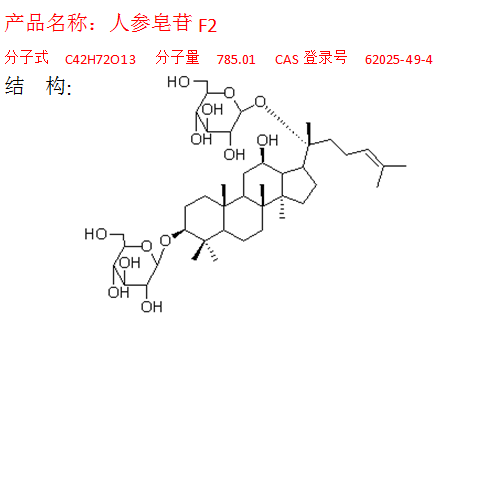 中文名稱 人參皂苷F2 中文別名 補充中 英文名 Ginsenoside F2 英文別名 無 分子式 C42H72O13 分子量 785.01 CAS登錄號 62025-49-4 提取來源 五加科植物人參Panax ginseng C. A. Mey.的干燥根 化學結構 外觀 白色粉末 鑒別方法 NMR,MS 貯存條件 4℃冷藏、密封、避光 有效期 2年注意事項 無 溶解性 易溶于水、甲醇、乙醇,不溶于乙醚、苯。 測定方法 HPLC法, 液相色譜條件: 色譜柱為Waters symmetry C18 ; 流動相為A:乙腈, B: 20% 乙腈-水,(A:B=30:70)體積流量: 0.3 mL/ min; 柱溫: 室溫; 進樣量: 10μL。 藥典測定方法 補充中 用途 用于含量測定/鑒定/藥理實驗等
